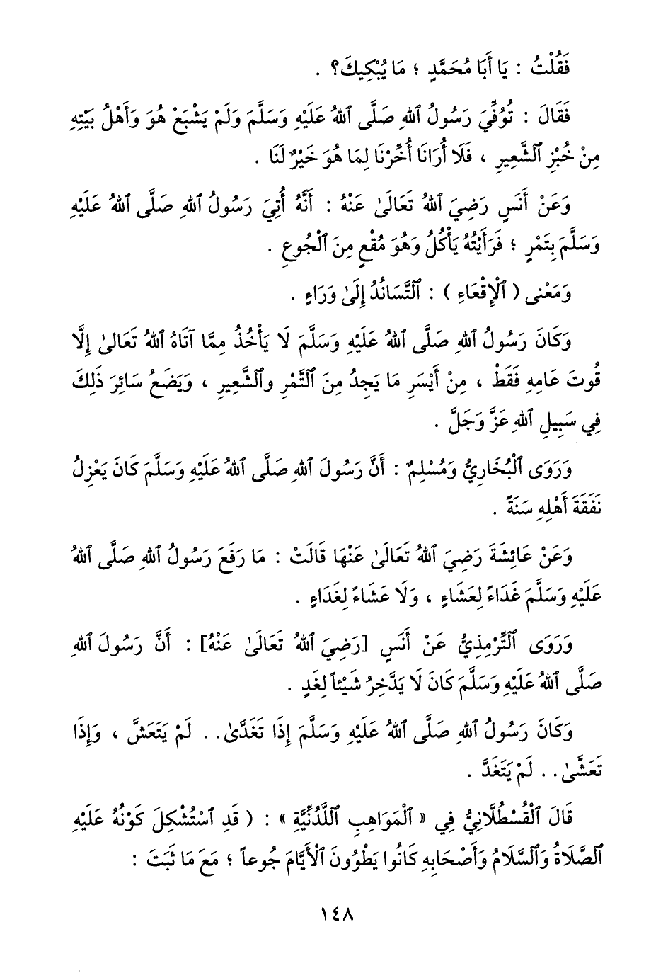 فقال: توفّي رسول الله صلّى الله عليه وسلّم ولم يشبع هو وأهل بيته من خبز الشّعير، فلا أرانا أخّرنا لما هو خير لنا.