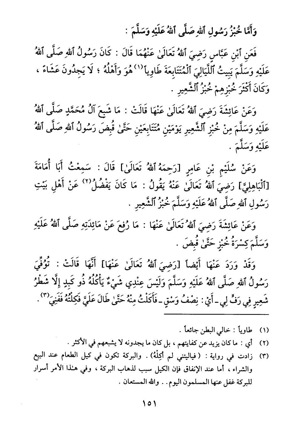 وعن عائشة رضي الله تعالى عنها قالت: ما شبع ال محمّد صلّى الله عليه وسلّم من خبز الشّعير يومين متتابعين حتّى قبض رسول الله صلّى الله عليه وسلّم.