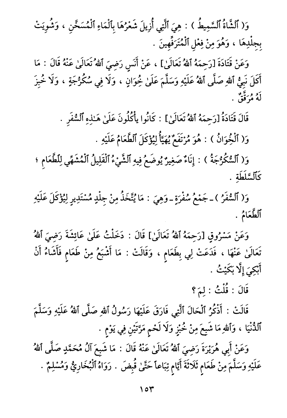 وعن قتادة [رحمه الله تعالى] ، عن أنس رضي الله تعالى عنه قال: ما أكل نبيّ الله صلّى الله عليه وسلّم على خوان، ولا في سكرّجة، ولا خبز له مرقّق.