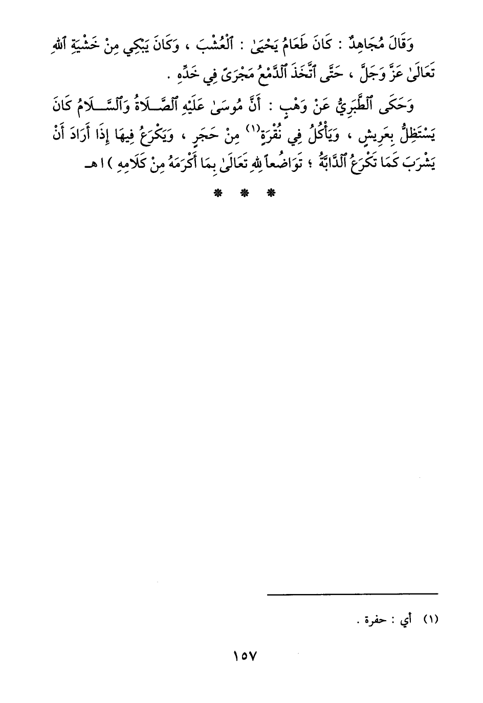 وحكى الطّبريّ عن وهب: أنّ موسى عليه الصّلاة والسّلام كان يستظلّ بعريش، ويأكل في نقرة «1» من حجر، ويكرع فيها إذا أراد أن يشرب كما تكرع الدّابّة؛ تواضعا لله تعالى بما أكرمه من كلامه) اهـ