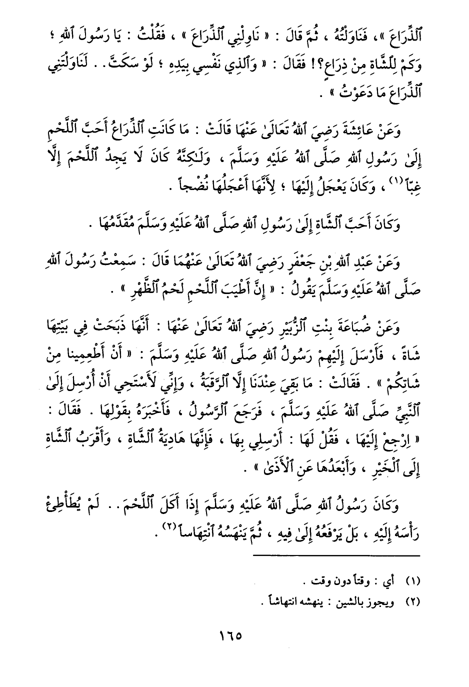وعن عائشة رضي الله تعالى عنها قالت: ما كانت الذّراع أحبّ اللّحم إلى رسول الله صلّى الله عليه وسلّم، ولكنّه كان لا يجد اللّحم إلّا غبّا «1» ، وكان يعجل إليها؛ لأنّها أعجلها نضجا.