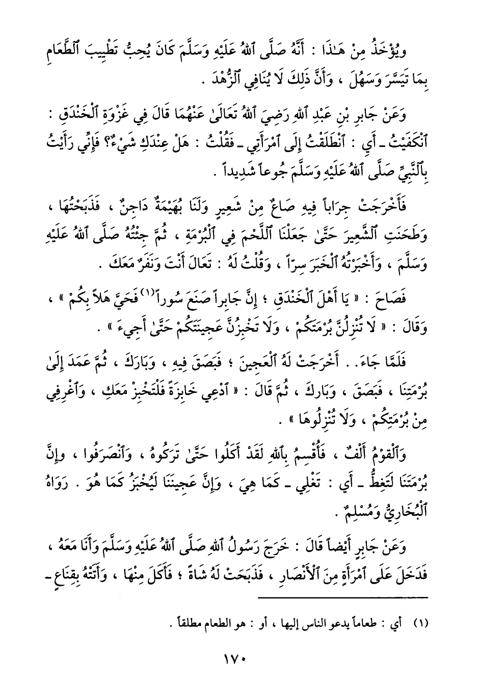 فأخرجت جرابا فيه صاع من شعير ولنا بهيمة داجن، فذبحتها، وطحنت الشّعير حتّى جعلنا اللّحم في البرمة، ثمّ جئته صلّى الله عليه وسلّم، وأخبرته الخبر سرّا، وقلت له: تعال أنت ونفر معك.