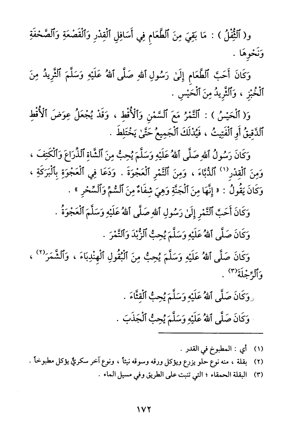 وكان رسول الله صلّى الله عليه وسلّم يحبّ من الشّاة الذّراع والكتف، ومن القدر «1» الدّبّاء، ومن التّمر العجوة. ودعا في العجوة بالبركة، وكان يقول: «إنّها من الجنّة وهي شفاء من السّمّ والسّحر» .