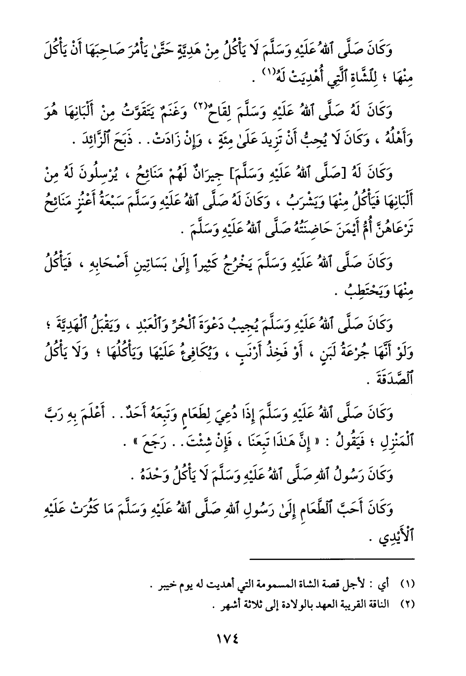وكان صلّى الله عليه وسلّم لا يأكل من هديّة حتّى يأمر صاحبها أن يأكل منها؛ للشّاة الّتي أهديت له «1» .