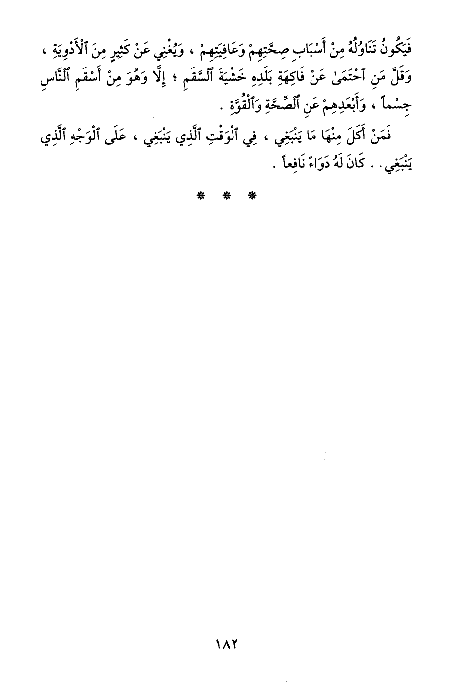 فيكون تناوله من أسباب صحّتهم وعافيتهم، ويغني عن كثير من الأدوية، وقلّ من احتمى عن فاكهة بلده خشية السّقم؛ إلّا وهو من أسقم النّاس جسما، وأبعدهم عن الصّحّة والقوّة.