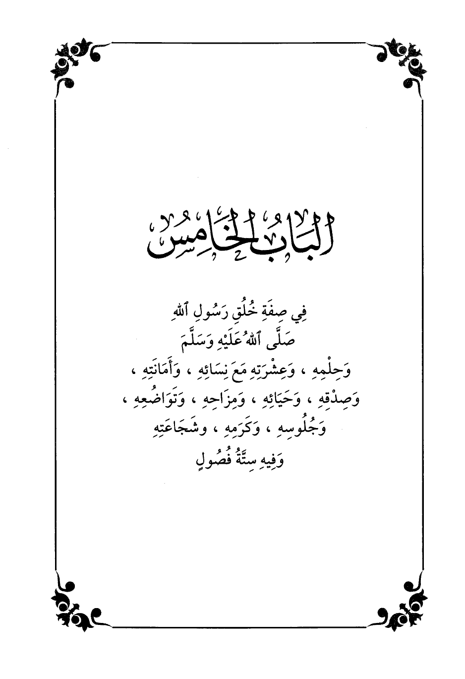 وحلمه، وعشرته مع نسائه، وأمانته، وصدقه، وحيائه، ومزاحه، وتواضعه، وجلوسه، وكرمه، وشجاعته وفيه ستّة فصول
