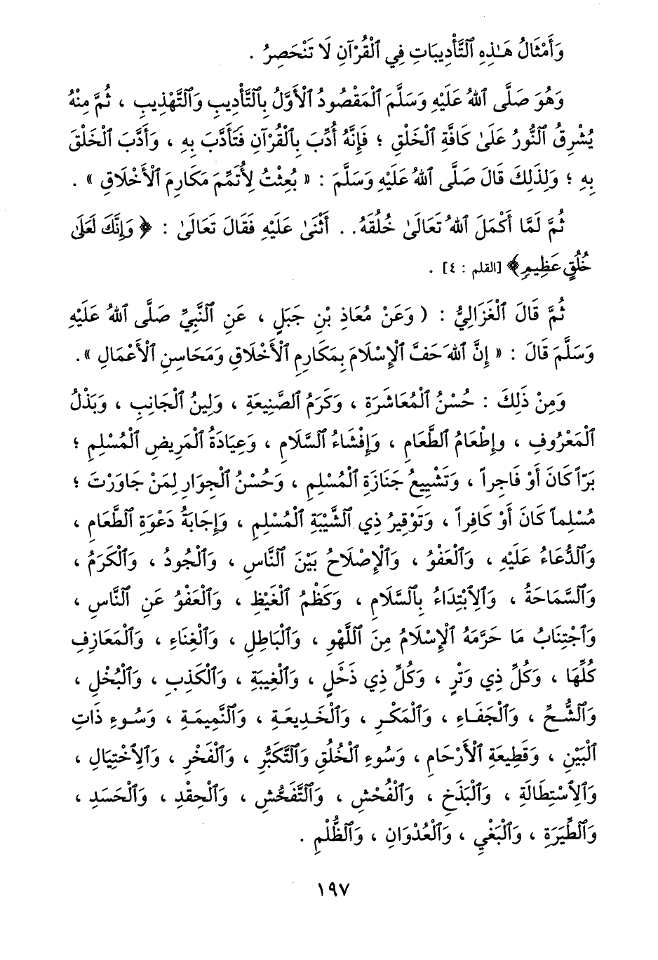 ثمّ قال الغزاليّ: (وعن معاذ بن جبل، عن النّبيّ صلّى الله عليه وسلّم قال: «إنّ الله حفّ الإسلام بمكارم الأخلاق ومحاسن الأعمال» .