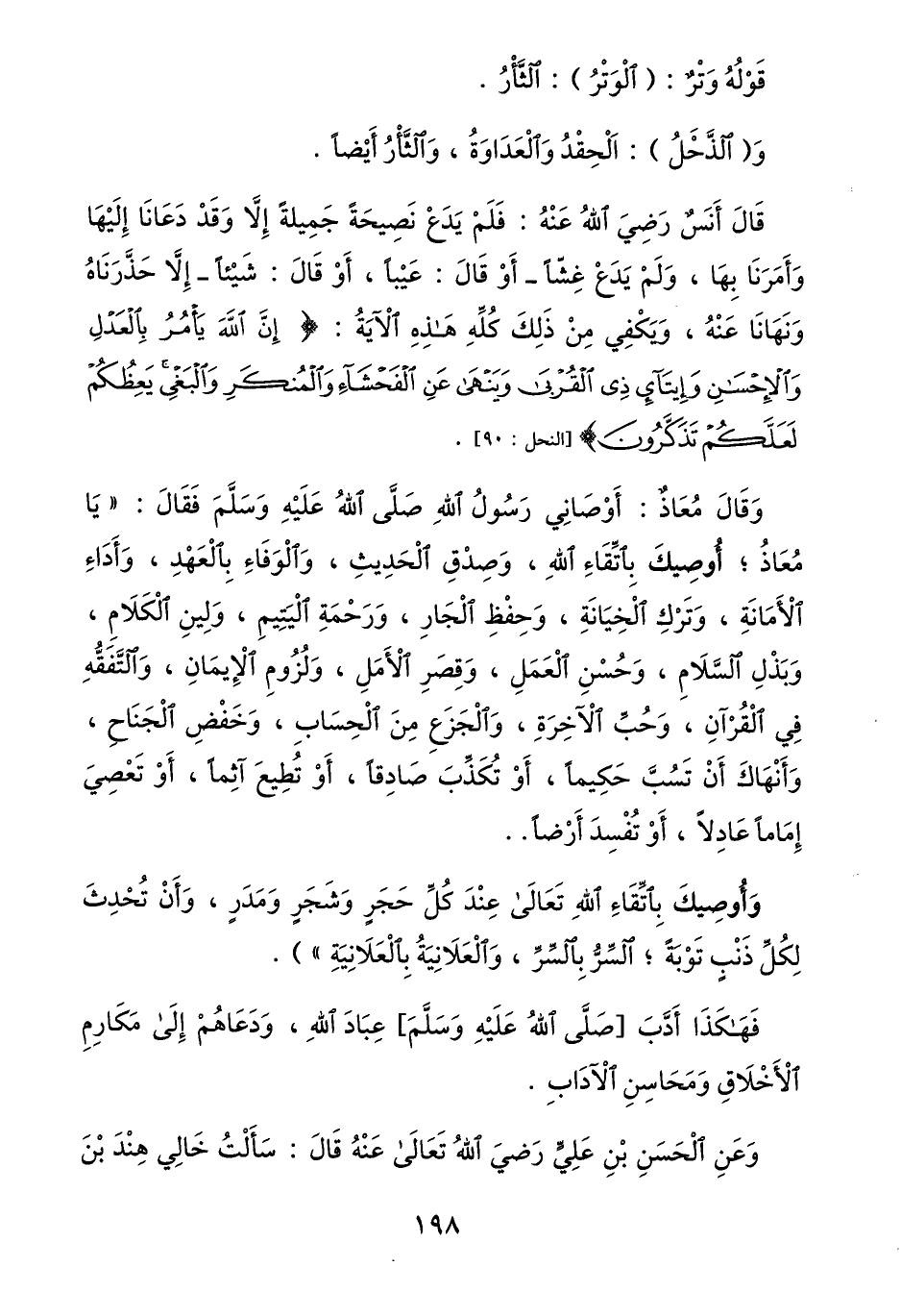 قال أنس رضي الله عنه: فلم يدع نصيحة جميلة إلّا وقد دعانا إليها وأمرنا بها، ولم يدع غشّا- أو قال: عيبا، أو قال: شيئا- إلّا حذّرناه ونهانا عنه، ويكفي من ذلك كلّه هذه الاية: إِنَّ اللَّهَ يَأْمُرُ بِالْعَدْلِ وَالْإِحْسانِ وَإِيتاءِ ذِي الْقُرْبى وَيَنْهى عَنِ الْفَحْشاءِ وَالْمُنْكَرِ وَالْبَغْيِ يَعِظُكُمْ لَعَلَّكُمْ تَذَكَّرُونَ [النحل: 90] .
