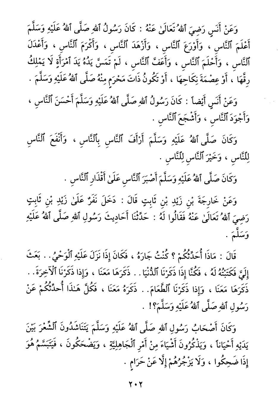 وعن أنس رضي الله تعالى عنه: كان رسول الله صلّى الله عليه وسلّم أعلم النّاس، وأورع النّاس، وأزهد النّاس، وأكرم النّاس، وأعدل النّاس، وأحلم النّاس، وأعفّ النّاس، لم تمسّ يده يد امرأة لا يملك رقّها، أو عصمة نكاحها، أو تكون ذات محرم منه صلّى الله عليه وسلّم.