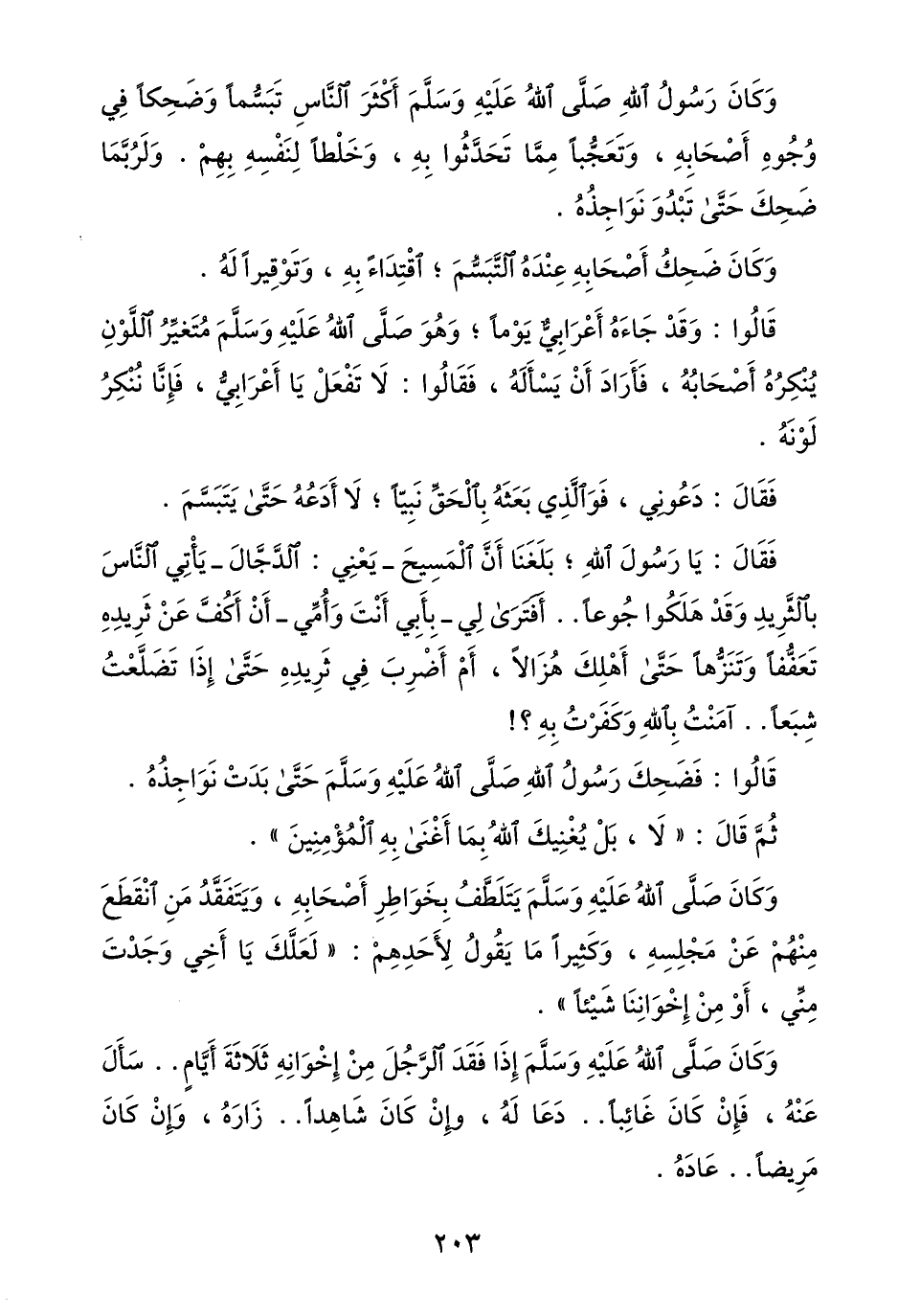 وكان رسول الله صلّى الله عليه وسلّم أكثر النّاس تبسّما وضحكا في وجوه أصحابه، وتعجّبا ممّا تحدّثوا به، وخلطا لنفسه بهم. ولربّما ضحك حتّى تبدو نواجذه.