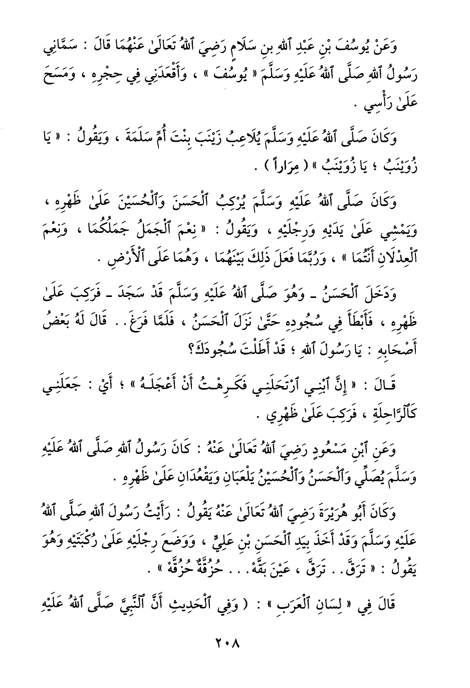 وعن ابن مسعود رضي الله تعالى عنه: كان رسول الله صلّى الله عليه وسلّم يصلّي والحسن والحسين يلعبان ويقعدان على ظهره.