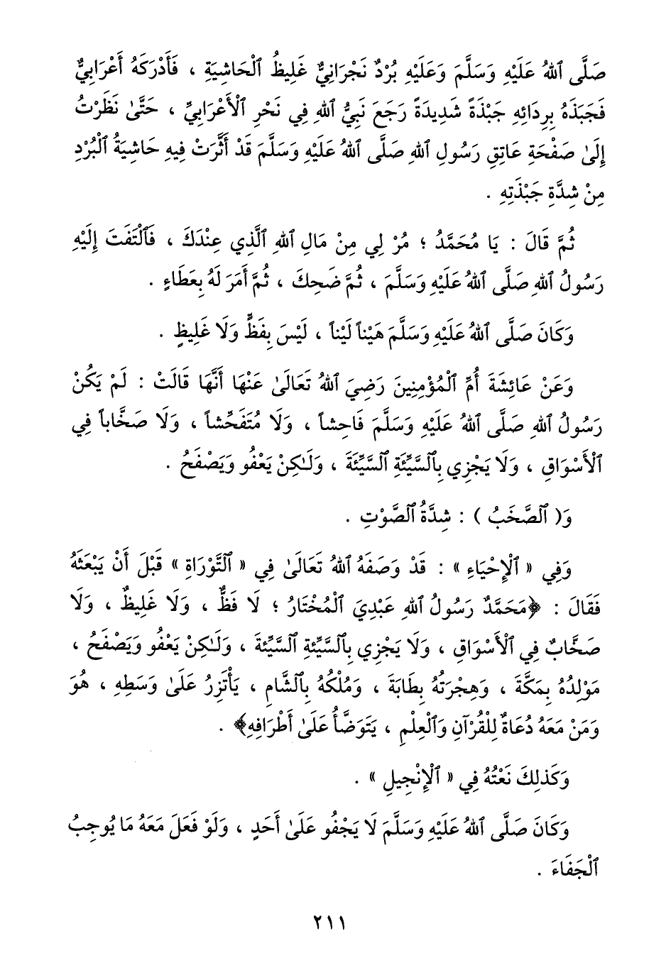 وفي «الإحياء» : قد وصفه الله تعالى في «التّوراة» قبل أن يبعثه فقال: (محمّد رسول الله عبدي المختار؛ لا فظّ، ولا غليظ، ولا صخّاب في الأسواق، ولا يجزي بالسّيّئة السّيّئة، ولكن يعفو ويصفح، مولده بمكّة، وهجرته بطابة، وملكه بالشّام، يأتزر على وسطه، هو ومن معه دعاة للقران والعلم، يتوضّأ على أطرافه) .