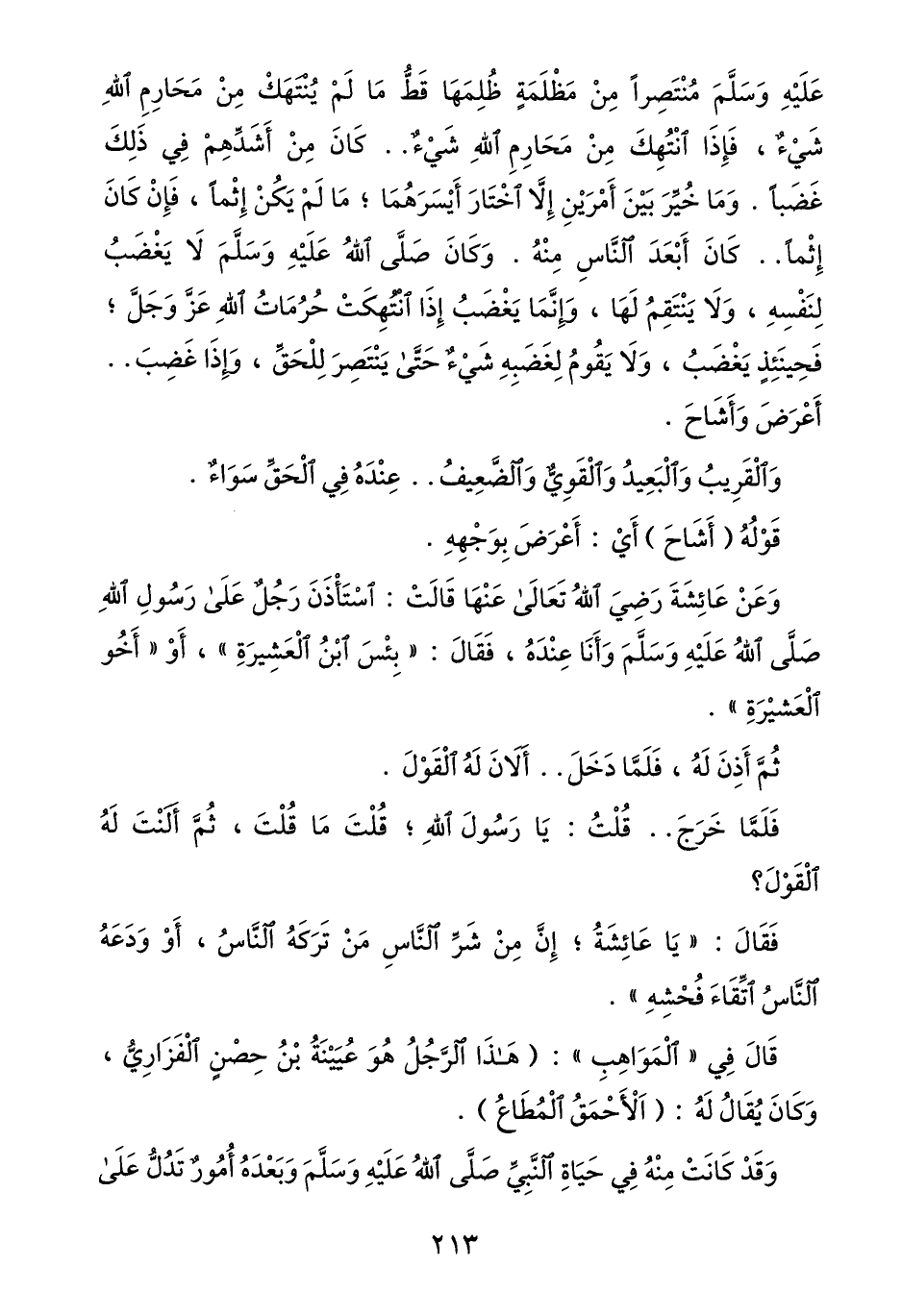 عليه وسلّم منتصرا من مظلمة ظلمها قطّ ما لم ينتهك من محارم الله شيء، فإذا انتهك من محارم الله شيء.. كان من أشدّهم في ذلك غضبا. وما خيّر بين أمرين إلّا اختار أيسرهما؛ ما لم يكن إثما، فإن كان إثما.. كان أبعد النّاس منه. وكان صلّى الله عليه وسلّم لا يغضب لنفسه، ولا ينتقم لها، وإنّما يغضب إذا انتهكت حرمات الله عزّ وجلّ؛ فحينئذ يغضب، ولا يقوم لغضبه شيء حتّى ينتصر للحقّ، وإذا غضب..