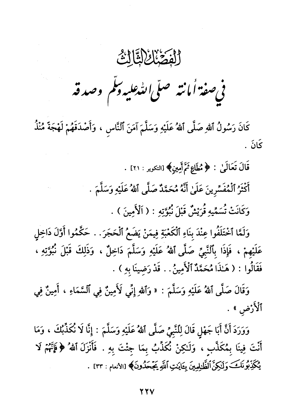 الفصل الثّالث في صفة أمانته صلّى الله عليه وسلّم وصدقه