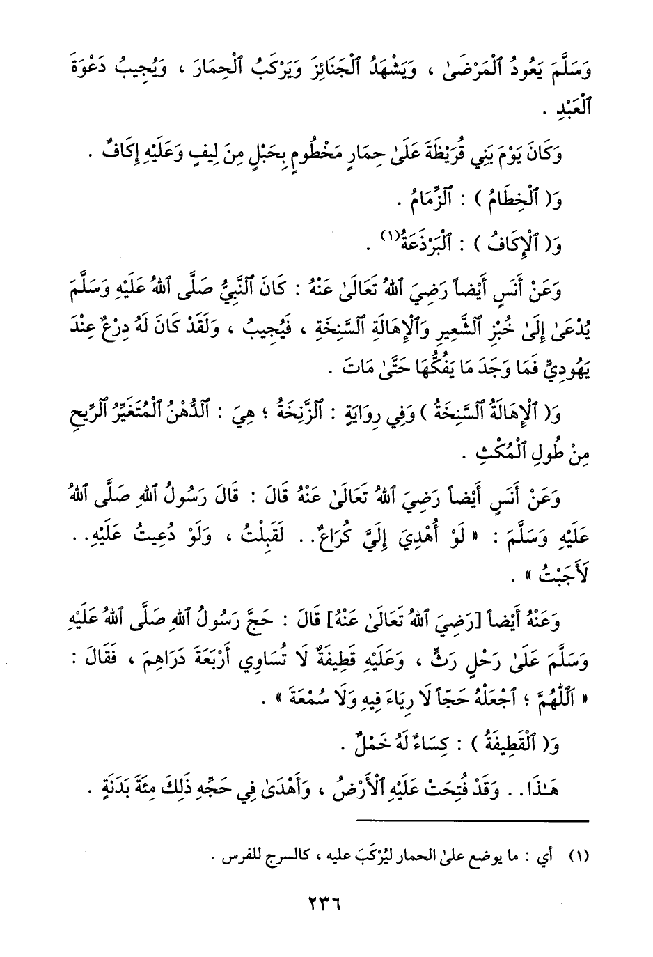 وعنه أيضا [رضي الله تعالى عنه] قال: حجّ رسول الله صلّى الله عليه وسلّم على رحل رثّ، وعليه قطيفة لا تساوي أربعة دراهم، فقال:
