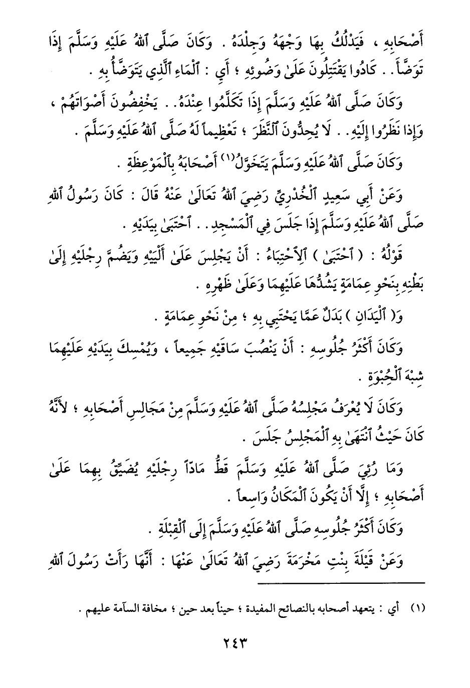وما رئي صلّى الله عليه وسلّم قطّ مادّا رجليه يضيّق بهما على أصحابه؛ إلّا أن يكون المكان واسعا.