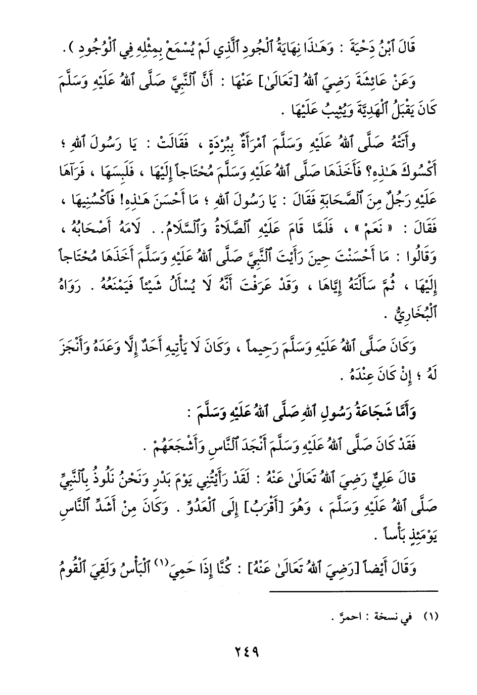 وأتته صلّى الله عليه وسلّم امرأة ببردة، فقالت: يا رسول الله؛ أكسوك هذه؟ فأخذها صلّى الله عليه وسلّم محتاجا إليها، فلبسها، فراها عليه رجل من الصّحابة فقال: يا رسول الله؛ ما أحسن هذه! فاكسنيها، فقال: «نعم» ، فلمّا قام عليه الصّلاة والسّلام.. لامه أصحابه، وقالوا: ما أحسنت حين رأيت النّبيّ صلّى الله عليه وسلّم أخذها محتاجا إليها، ثمّ سألته إيّاها، وقد عرفت أنّه لا يسأل شيئا فيمنعه. رواه البخاريّ.