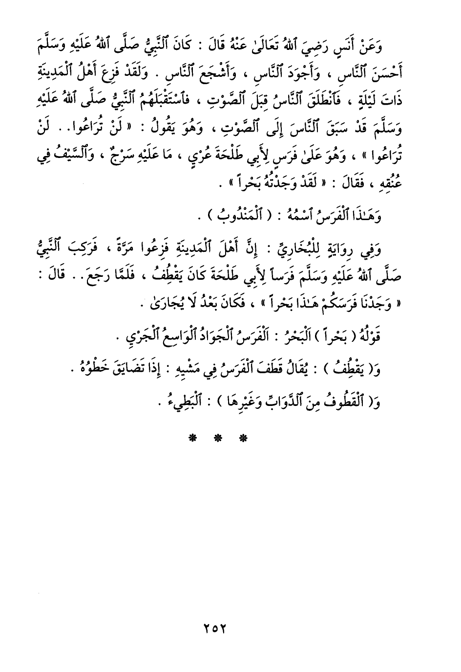 وعن أنس رضي الله تعالى عنه قال: كان النّبيّ صلّى الله عليه وسلّم أحسن النّاس، وأجود النّاس، وأشجع النّاس. ولقد فزع أهل المدينة ذات ليلة، فانطلق النّاس قبل الصّوت، فاستقبلهم النّبيّ صلّى الله عليه وسلّم قد سبق النّاس إلى الصّوت، وهو يقول: «لن تراعوا.. لن تراعوا» ، وهو على فرس لأبي طلحة عري، ما عليه سرج، والسّيف في عنقه، فقال: «لقد وجدته بحرا» .