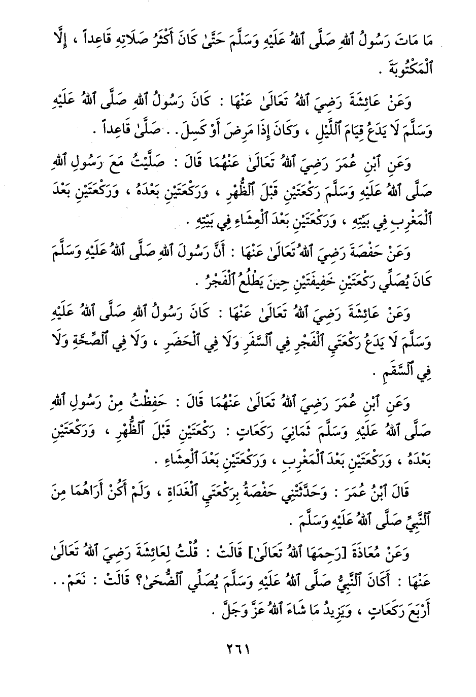 وعن عائشة رضي الله تعالى عنها: كان رسول الله صلّى الله عليه وسلّم لا يدع ركعتي الفجر في السّفر ولا في الحضر، ولا في الصّحّة ولا في السّقم.