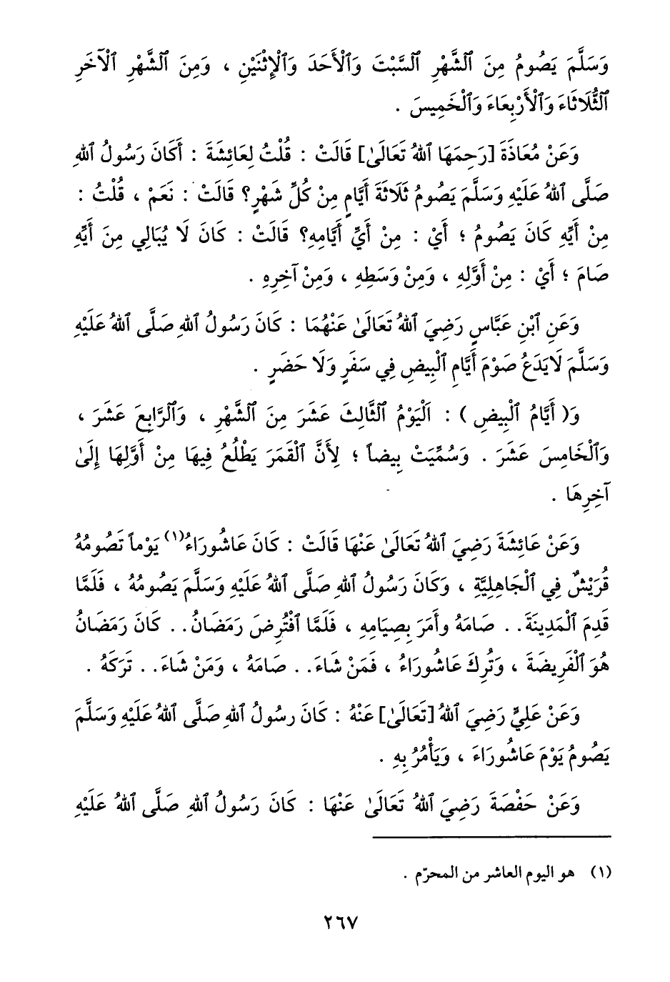 وعن معاذة [رحمها الله تعالى] قالت: قلت لعائشة: أكان رسول الله صلّى الله عليه وسلّم يصوم ثلاثة أيّام من كلّ شهر؟ قالت: نعم، قلت: