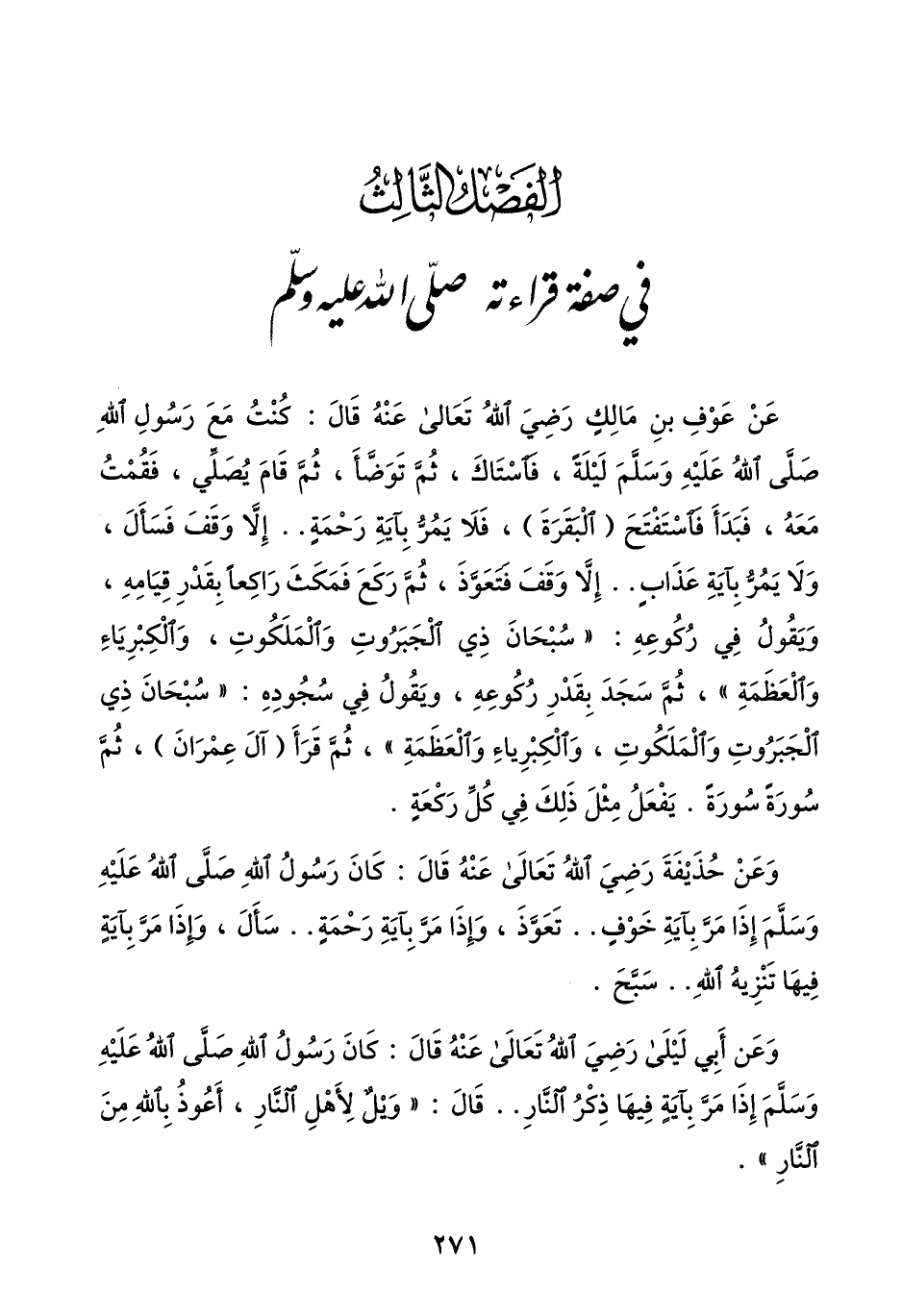 عن عوف بن مالك رضي الله تعالى عنه قال: كنت مع رسول الله صلّى الله عليه وسلّم ليلة، فاستاك، ثمّ توضّأ، ثمّ قام يصلّي، فقمت معه، فبدأ فاستفتح (البقرة) ، فلا يمرّ باية رحمة.. إلّا وقف فسأل، ولا يمرّ باية عذاب.. إلّا وقف فتعوّذ، ثمّ ركع فمكث راكعا بقدر قيامه، ويقول في ركوعه: «سبحان ذي الجبروت والملكوت، والكبرياء والعظمة» ، ثمّ سجد بقدر ركوعه، ويقول في سجوده: «سبحان ذي الجبروت والملكوت، والكبرياء والعظمة» ، ثمّ قرأ (ال عمران) ، ثمّ سورة سورة. يفعل مثل ذلك في كلّ ركعة.