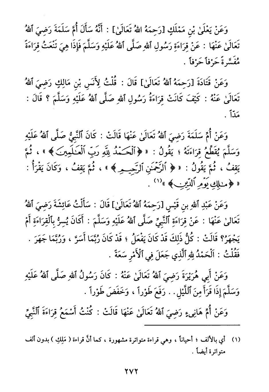 وعن يعلى بن مملك [رحمه الله تعالى] : أنّه سأل أمّ سلمة رضي الله تعالى عنها: عن قراءة رسول الله صلّى الله عليه وسلّم فإذا هي تنعت قراءة مفسّرة حرفا حرفا.