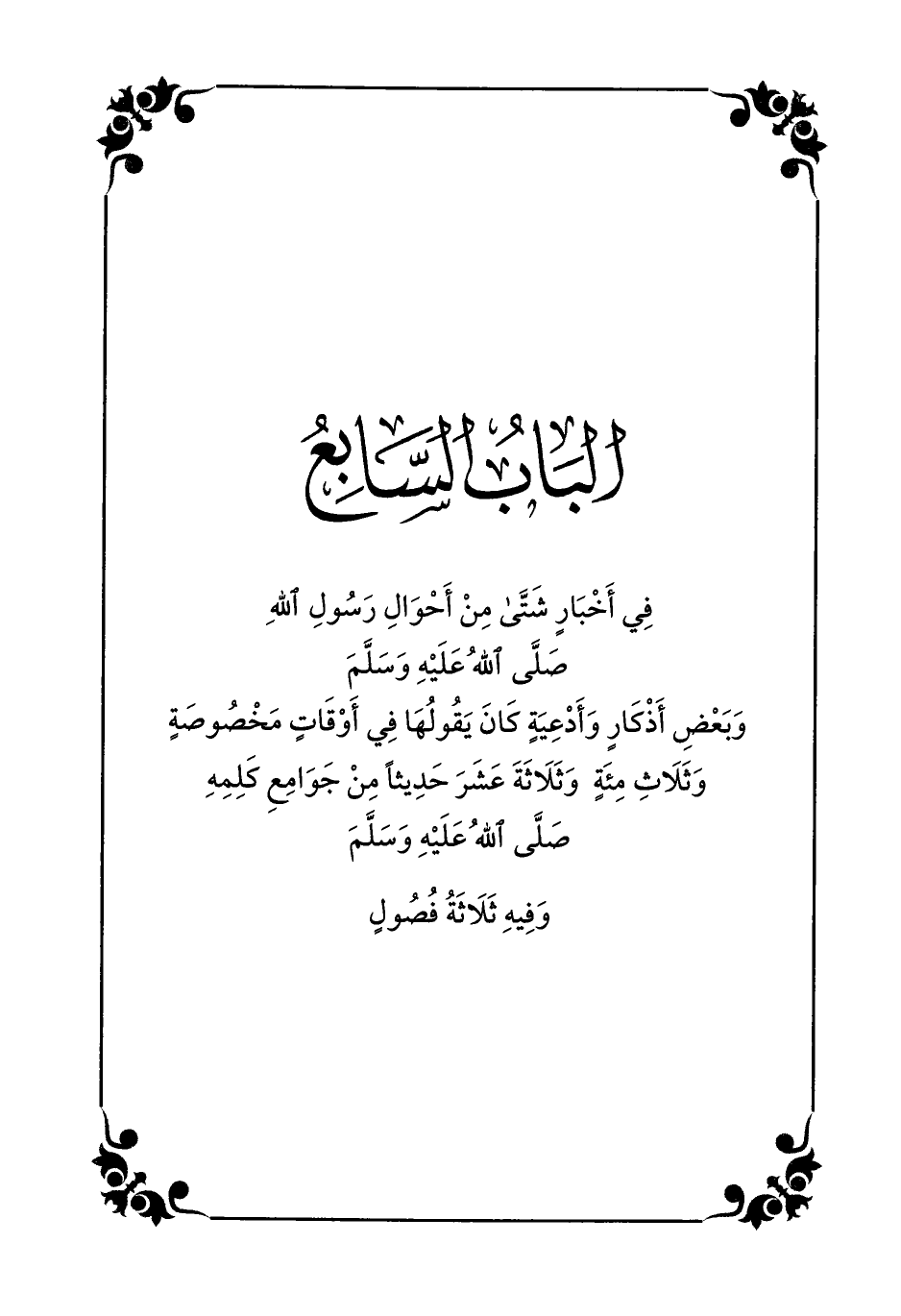 وبعض أذكار وأدعية كان يقولها في أوقات مخصوصة وثلاث مئة وثلاثة عشر حديثا من جوامع كلمه صلّى الله عليه وسلّم وفيه ثلاثة فصول