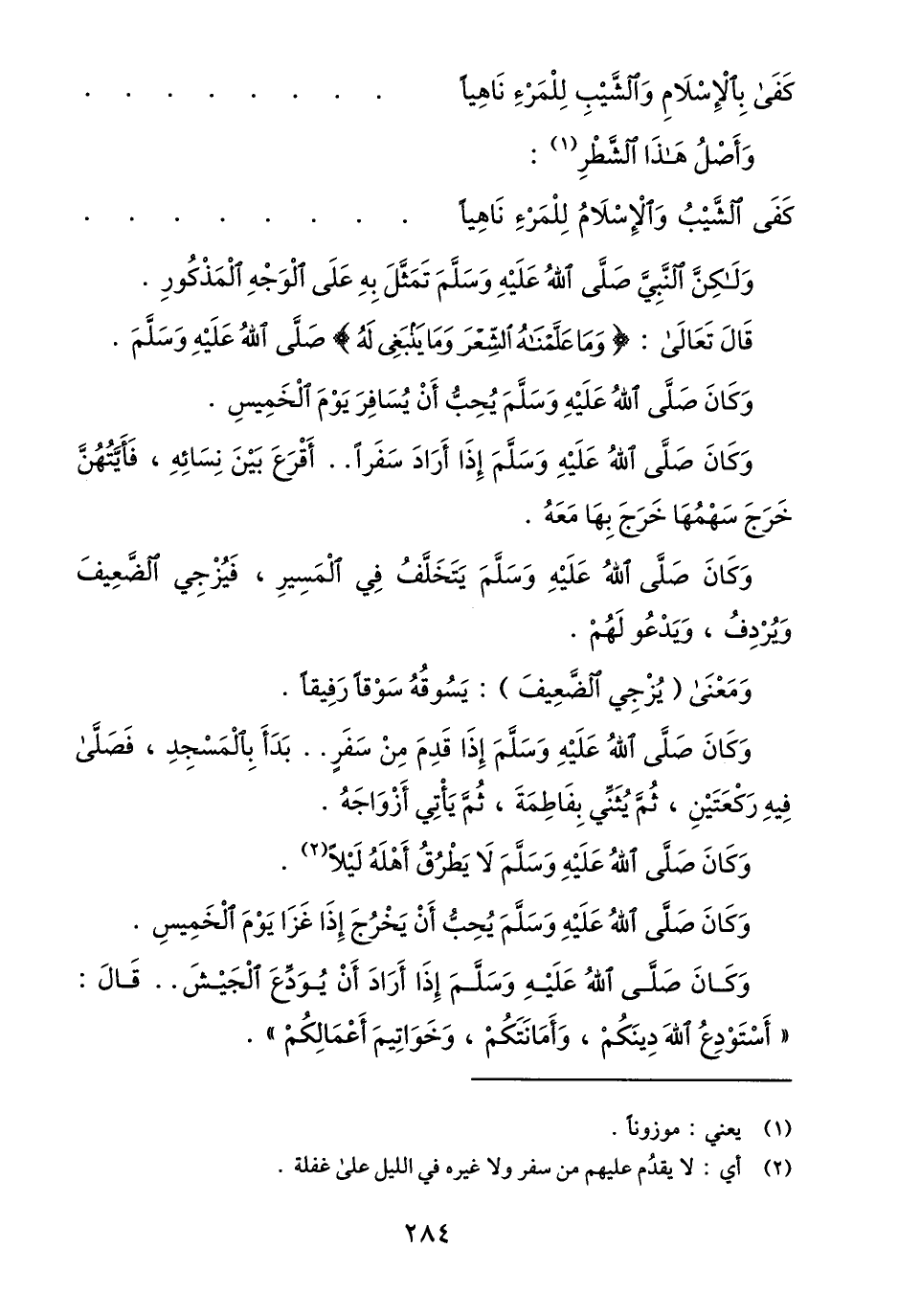 وكان صلّى الله عليه وسلّم إذا قدم من سفر.. بدأ بالمسجد، فصلّى فيه ركعتين، ثمّ يثنّي بفاطمة، ثمّ يأتي أزواجه.