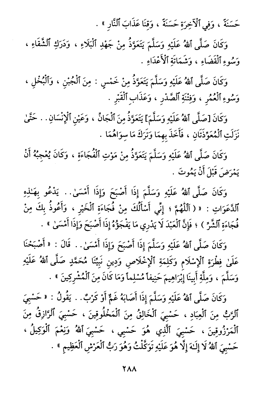 وكان صلّى الله عليه وسلّم إذا أصابه غمّ أو كرب.. يقول: «حسبي الرّبّ من العباد، حسبي الخالق من المخلوقين، حسبي الرّازق من المرزوقين، حسبي الّذي هو حسبي، حسبي الله ونعم الوكيل، حسبي الله لا إله إلّا هو عليه توكّلت وهو ربّ العرش العظيم» .