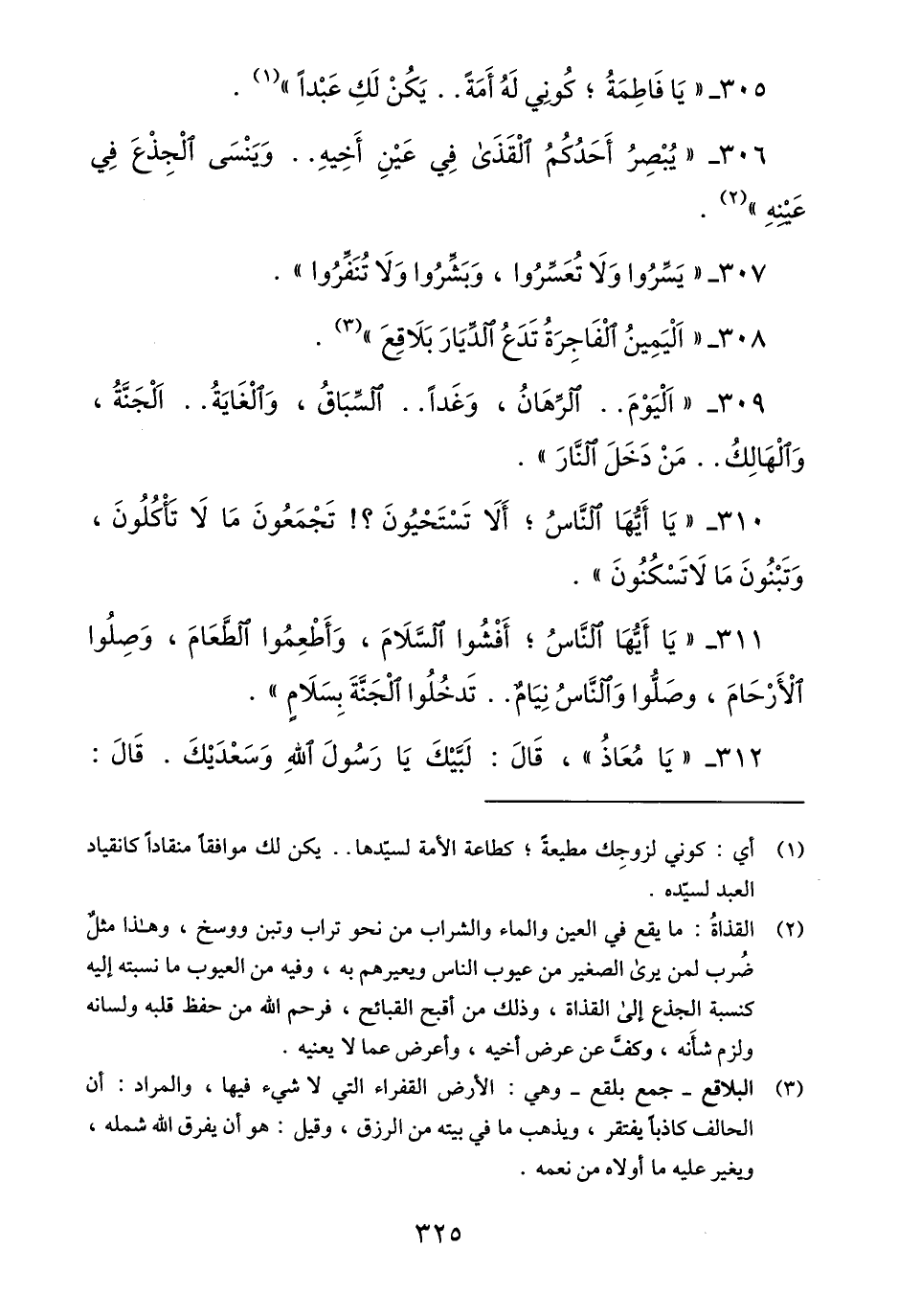 312- «يا معاذ» ، قال: لبّيك يا رسول الله وسعديك. قال: