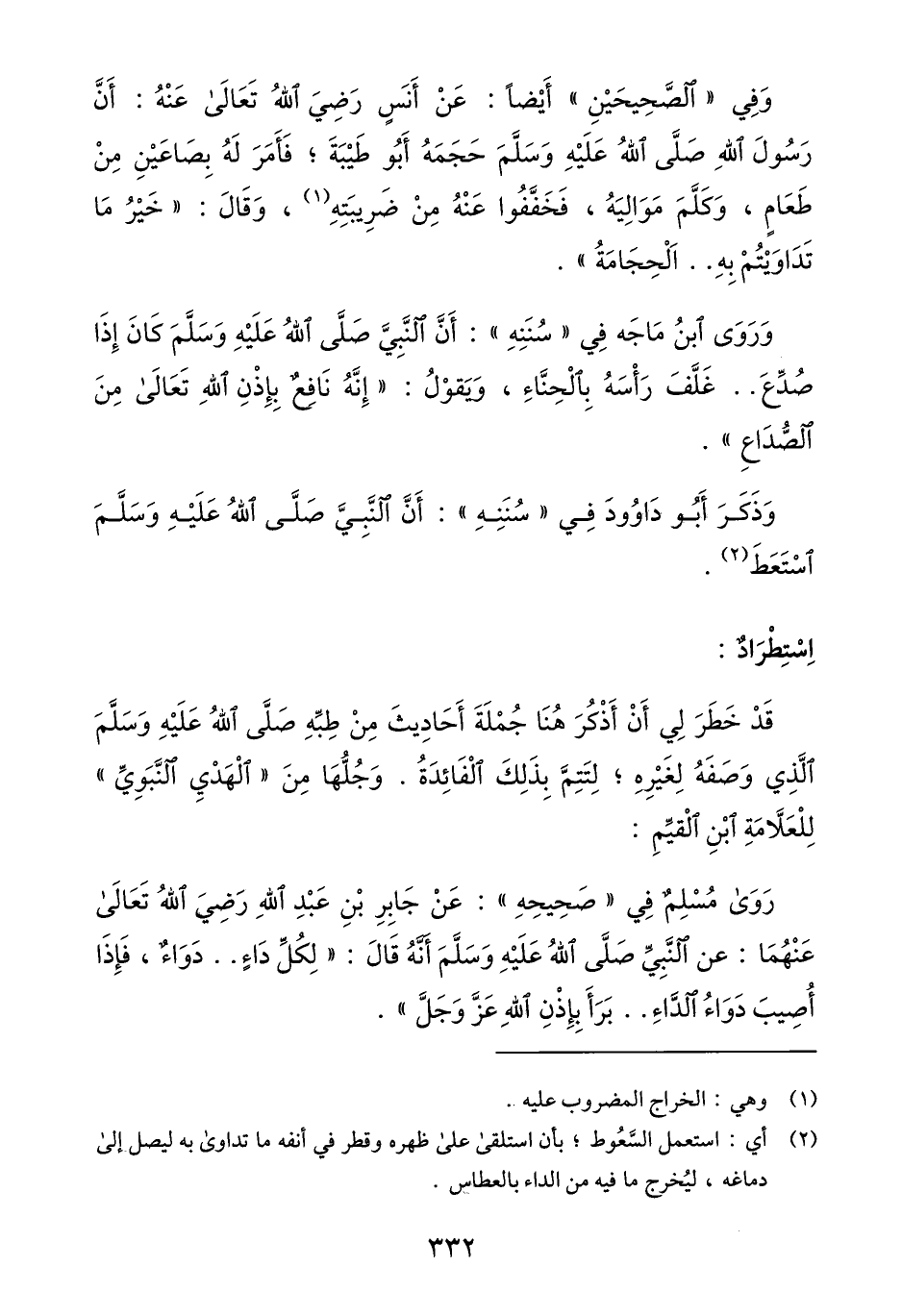 قد خطر لي أن أذكر هنا جملة أحاديث من طبّه صلّى الله عليه وسلّم الّذي وصفه لغيره؛ لتتمّ بذلك الفائدة. وجلّها من «الهدي النّبويّ» للعلّامة ابن القيّم: