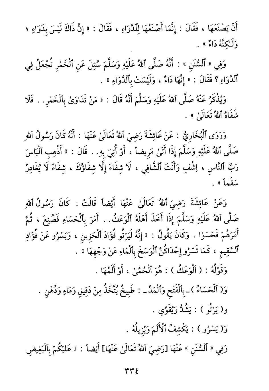 وعن عائشة رضي الله تعالى عنها أيضا قالت: كان رسول الله صلّى الله عليه وسلّم إذا أخذ أهله الوعك.. أمر بالحساء فصنع، ثمّ أمرهم فحسوا. وكان يقول: «إنّه ليرتو فؤاد الحزين، ويسرو عن فؤاد السّقيم، كما تسرو إحداكنّ الوسخ بالماء عن وجهها» .