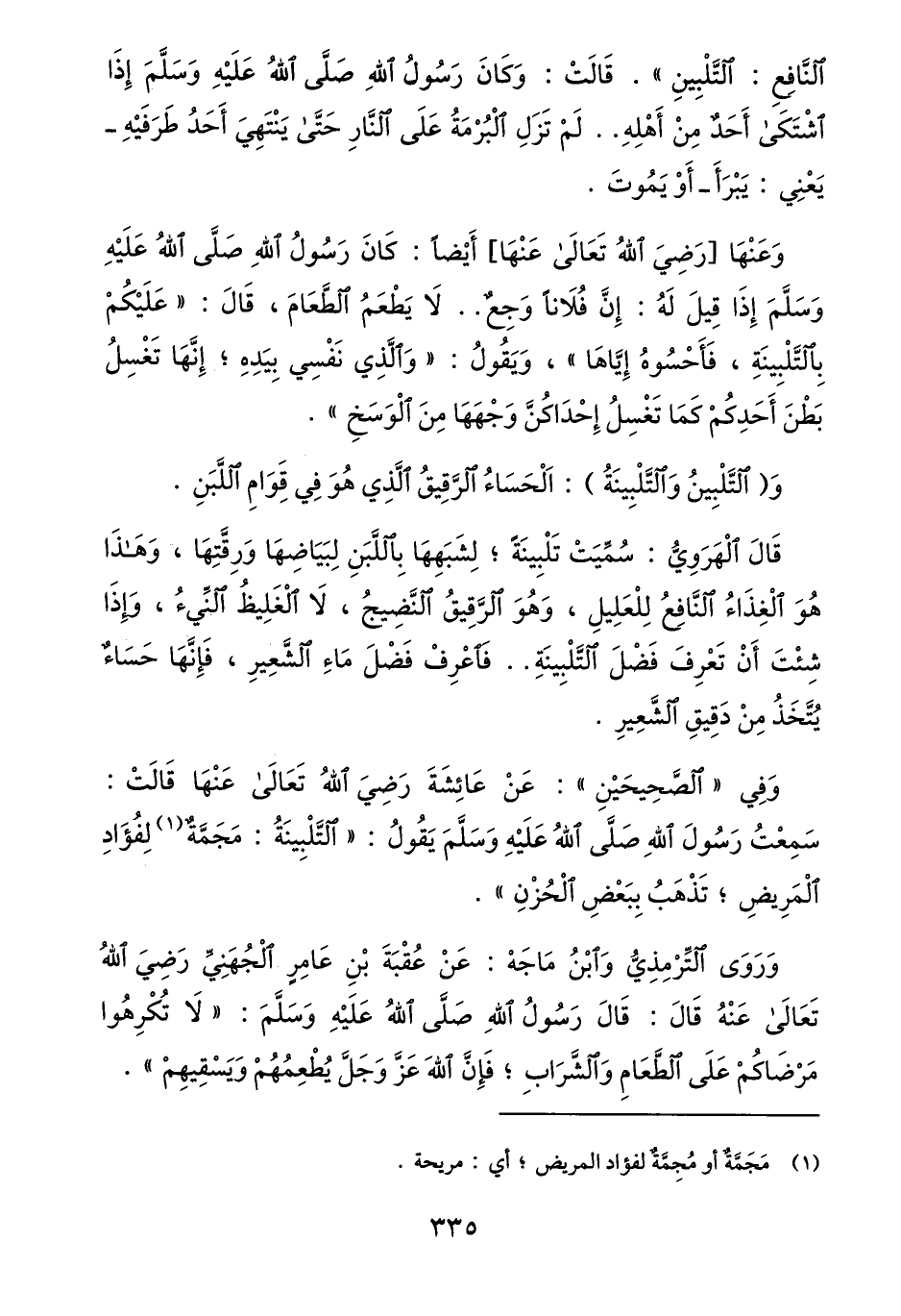 وعنها [رضي الله تعالى عنها] أيضا: كان رسول الله صلّى الله عليه وسلّم إذا قيل له: إنّ فلانا وجع.. لا يطعم الطّعام، قال: «عليكم بالتّلبينة، فأحسوه إيّاها» ، ويقول: «والّذي نفسي بيده؛ إنّها تغسل بطن أحدكم كما تغسل إحداكنّ وجهها من الوسخ» .