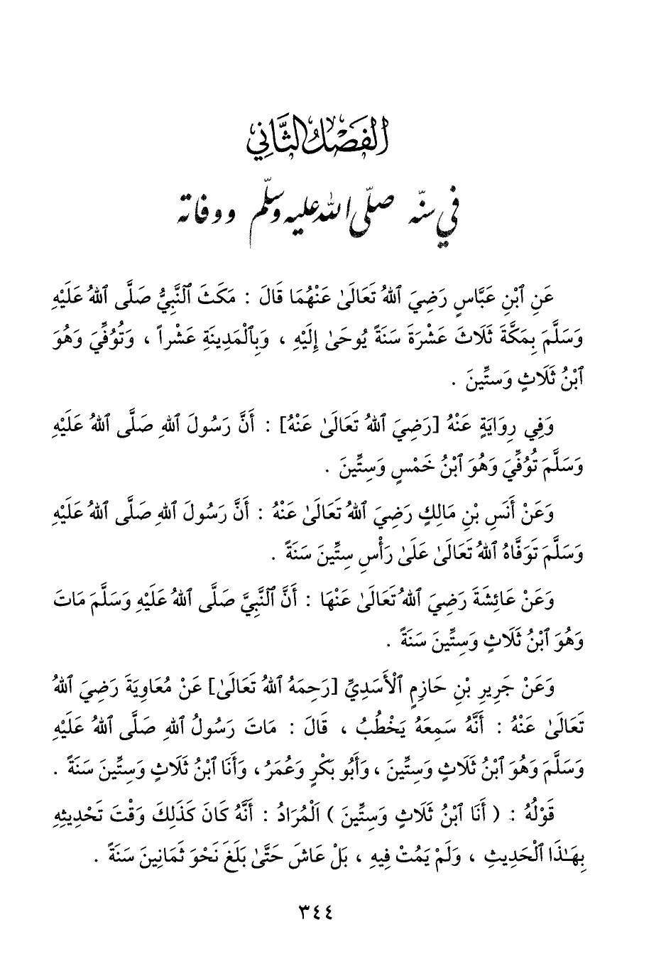 عن ابن عبّاس رضي الله تعالى عنهما قال: مكث النّبيّ صلّى الله عليه وسلّم بمكّة ثلاث عشرة سنة يوحى إليه، وبالمدينة عشرا، وتوفّي وهو ابن ثلاث وستّين.