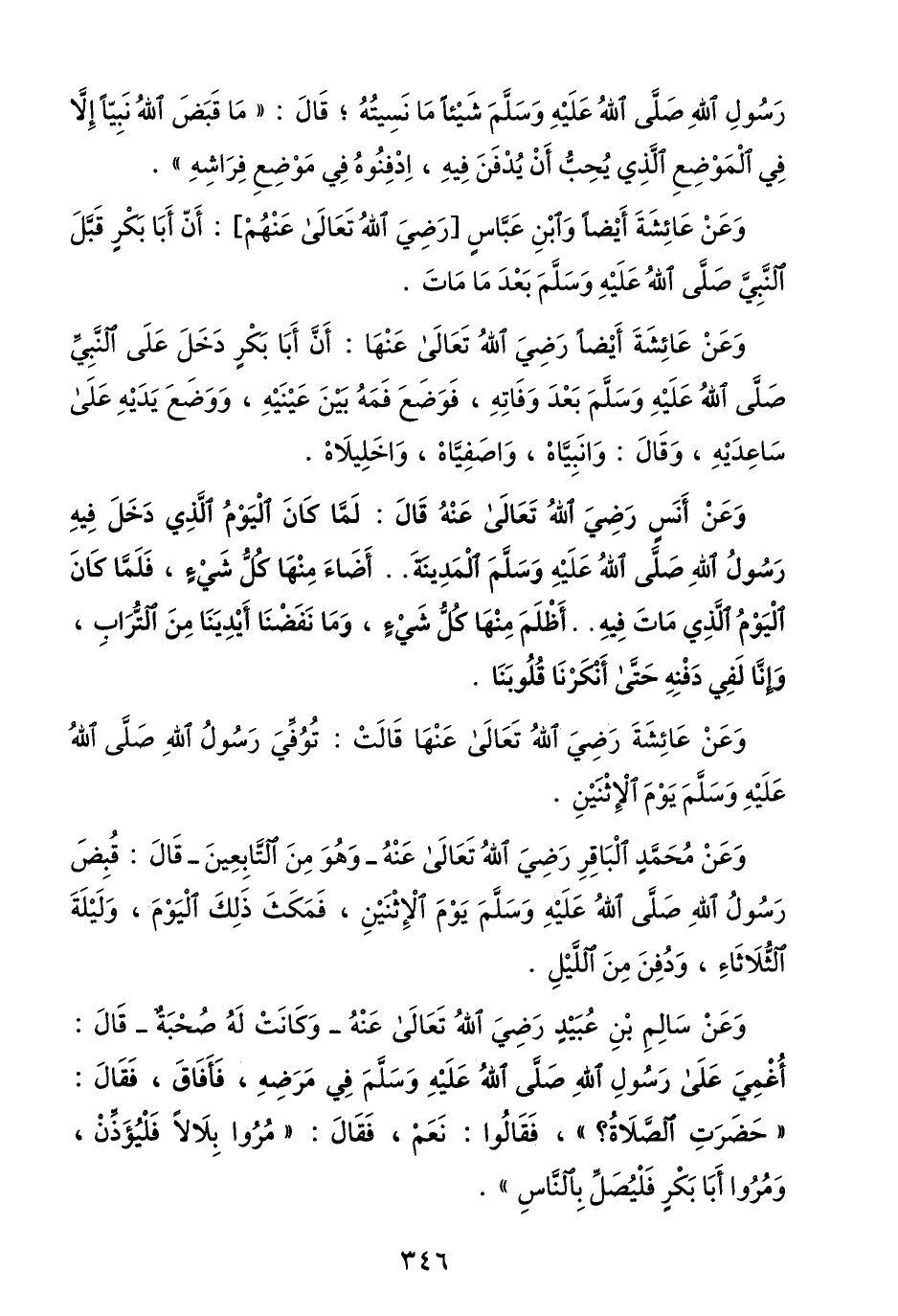 وعن محمّد الباقر رضي الله تعالى عنه- وهو من التّابعين- قال: قبض رسول الله صلّى الله عليه وسلّم يوم الإثنين، فمكث ذلك اليوم، وليلة الثّلاثاء، ودفن من اللّيل.