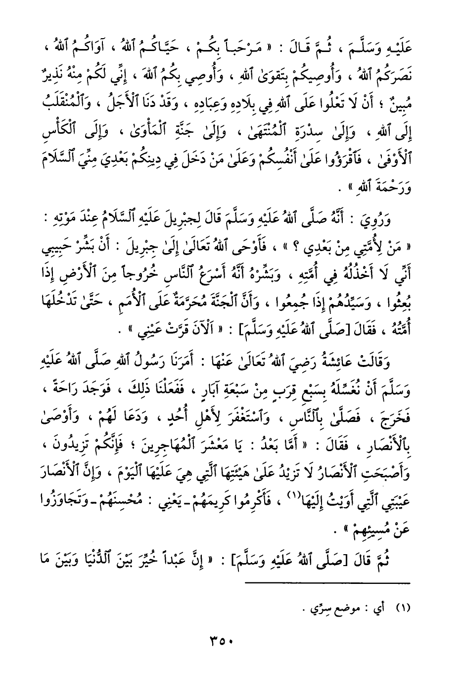 وقالت عائشة رضي الله تعالى عنها: أمرنا رسول الله صلّى الله عليه وسلّم أن نغسّله بسبع قرب من سبعة ابار، ففعلنا ذلك، فوجد راحة، فخرج، فصلّى بالنّاس، واستغفر لأهل أحد، ودعا لهم، وأوصى بالأنصار، فقال: «أمّا بعد: يا معشر المهاجرين؛ فإنّكم تزيدون، وأصبحت الأنصار لا تزيد على هيئتها الّتي هي عليها اليوم، وإنّ الأنصار عيبتي الّتي أويت إليها «1» ، فأكرموا كريمهم- يعني: محسنهم- وتجاوزوا عن مسيئهم» .