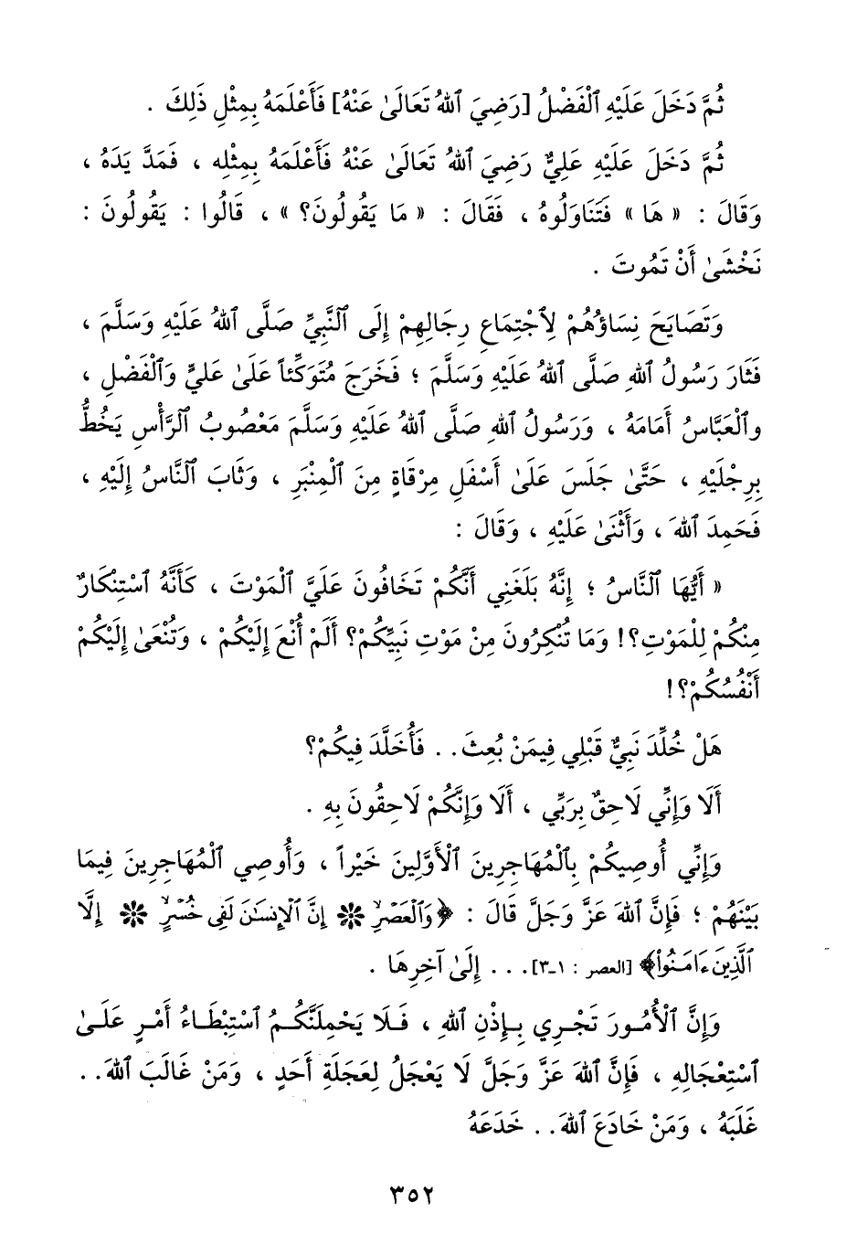 وتصايح نساؤهم لاجتماع رجالهم إلى النّبيّ صلّى الله عليه وسلّم، فثار رسول الله صلّى الله عليه وسلّم؛ فخرج متوكّئا على عليّ والفضل، والعبّاس أمامه، ورسول الله صلّى الله عليه وسلّم معصوب الرّأس يخطّ برجليه، حتّى جلس على أسفل مرقاة من المنبر، وثاب النّاس إليه، فحمد الله، وأثنى عليه، وقال:
