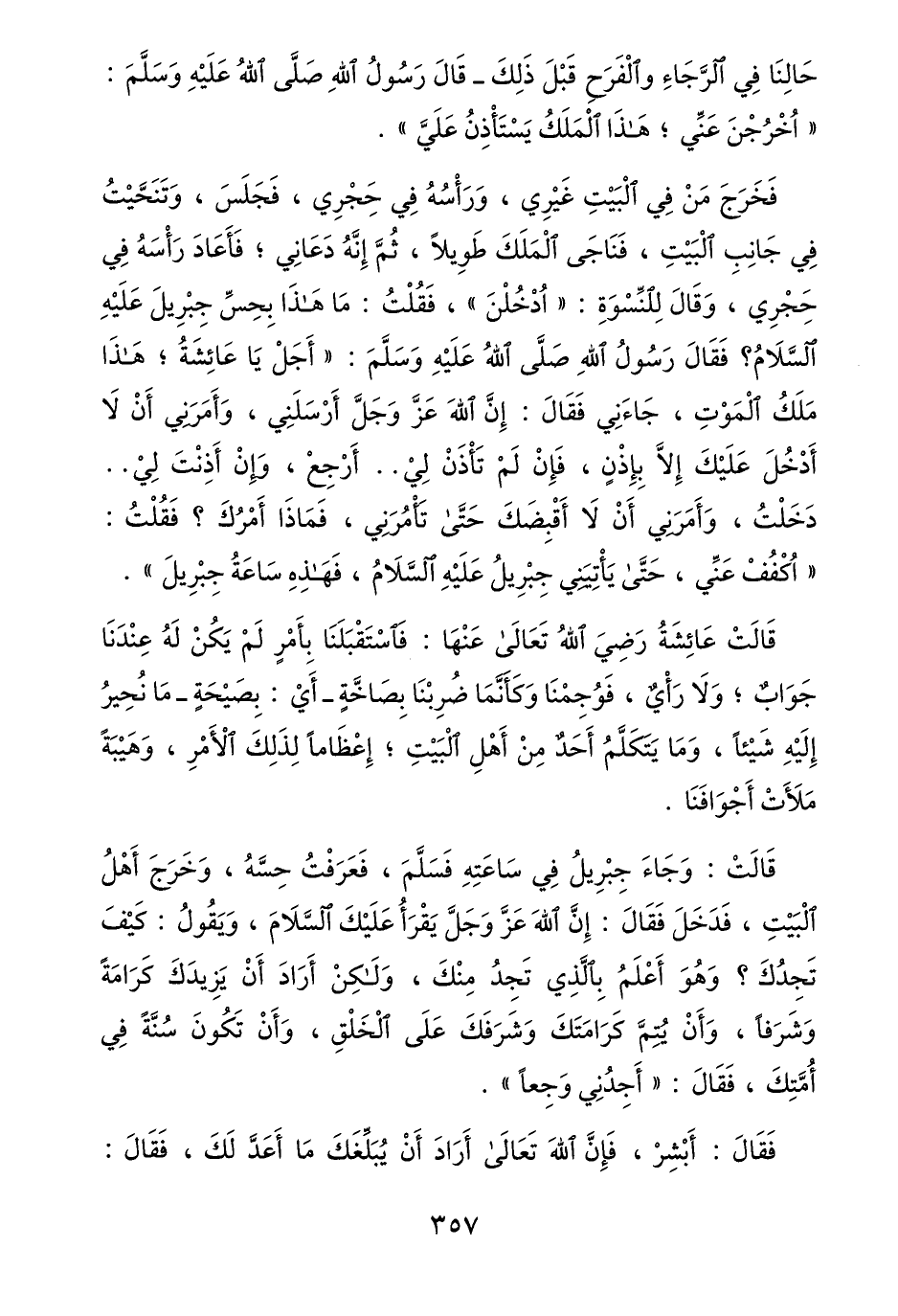 فخرج من في البيت غيري، ورأسه في حجري، فجلس، وتنحّيت في جانب البيت، فناجى الملك طويلا، ثمّ إنّه دعاني؛ فأعاد رأسه في حجري، وقال للنّسوة: «ادخلن» ، فقلت: ما هذا بحسّ جبريل عليه السّلام؟ فقال رسول الله صلّى الله عليه وسلّم: «أجل يا عائشة؛ هذا ملك الموت، جاءني فقال: إنّ الله عزّ وجلّ أرسلني، وأمرني أن لا أدخل عليك إلّا بإذن، فإن لم تأذن لي.. أرجع، وإن أذنت لي..