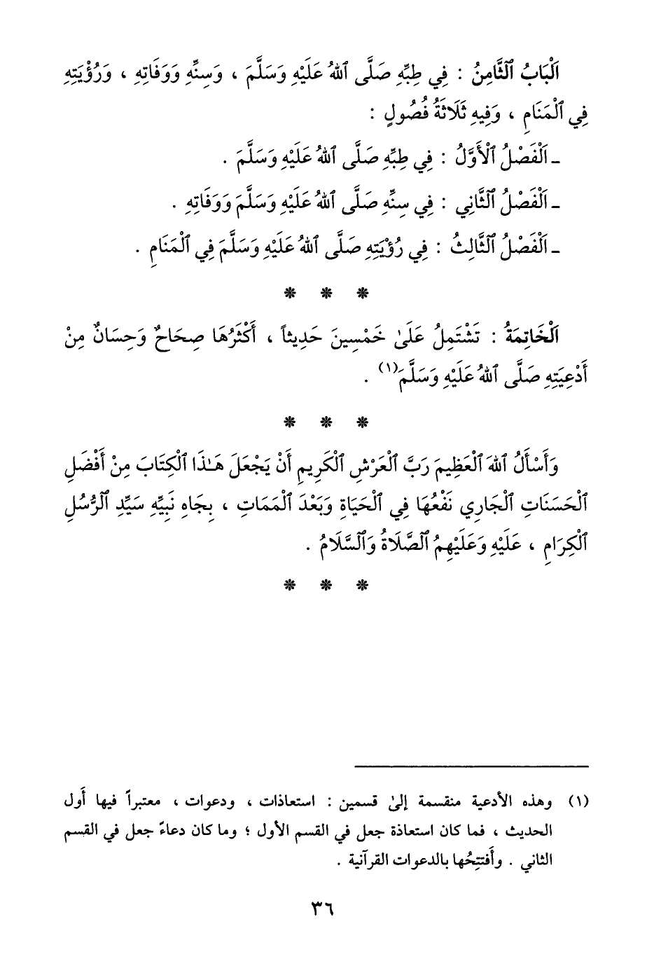الخاتمة: تشتمل على خمسين حديثا، أكثرها صحاح وحسان من أدعيته صلّى الله عليه وسلّم «1» .