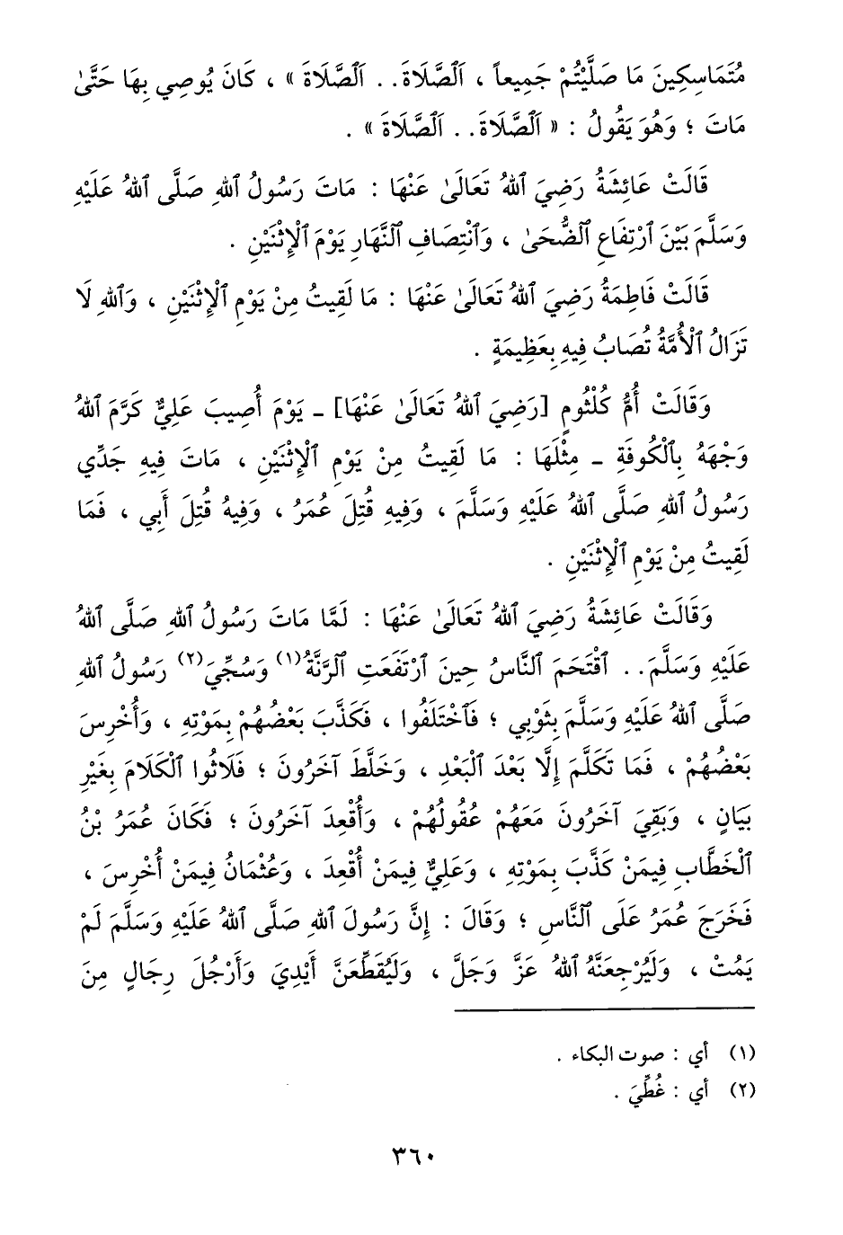 وقالت عائشة رضي الله تعالى عنها: لمّا مات رسول الله صلّى الله عليه وسلّم.. اقتحم النّاس حين ارتفعت الرّنّة «1» وسجّي «2» رسول الله صلّى الله عليه وسلّم بثوبي؛ فاختلفوا، فكذّب بعضهم بموته، وأخرس بعضهم، فما تكلّم إلّا بعد البعد، وخلّط اخرون؛ فلاثوا الكلام بغير بيان، وبقي اخرون معهم عقولهم، وأقعد اخرون؛ فكان عمر بن الخطّاب فيمن كذّب بموته، وعليّ فيمن أقعد، وعثمان فيمن أخرس، فخرج عمر على النّاس؛ وقال: إنّ رسول الله صلّى الله عليه وسلّم لم يمت، وليرجعنّه الله عزّ وجلّ، وليقطّعنّ أيدي وأرجل رجال من