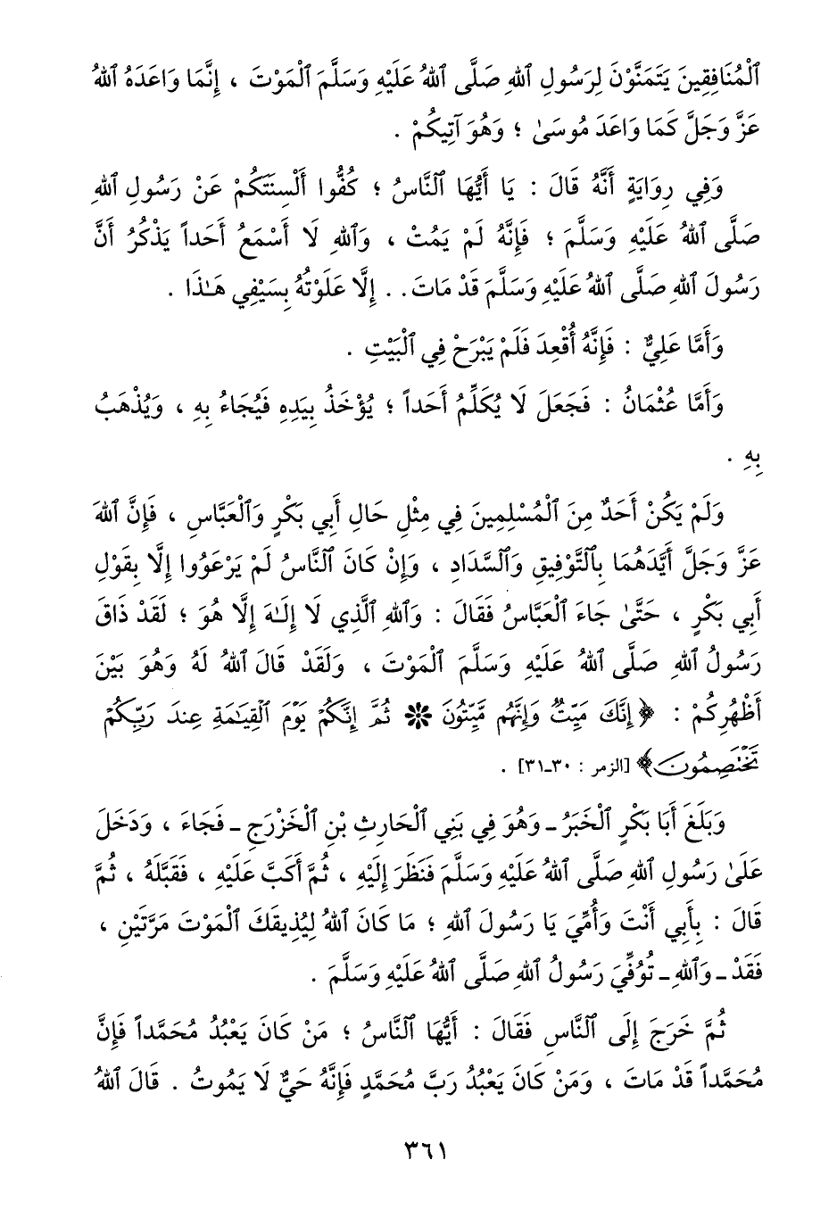 ولم يكن أحد من المسلمين في مثل حال أبي بكر والعبّاس، فإنّ الله عزّ وجلّ أيّدهما بالتّوفيق والسّداد، وإن كان النّاس لم يرعووا إلّا بقول أبي بكر، حتّى جاء العبّاس فقال: والله الّذي لا إله إلّا هو؛ لقد ذاق رسول الله صلّى الله عليه وسلّم الموت، ولقد قال الله له وهو بين أظهركم: إِنَّكَ مَيِّتٌ وَإِنَّهُمْ مَيِّتُونَ. ثُمَّ إِنَّكُمْ يَوْمَ الْقِيامَةِ عِنْدَ رَبِّكُمْ تَخْتَصِمُونَ [الزمر: 30- 31] .