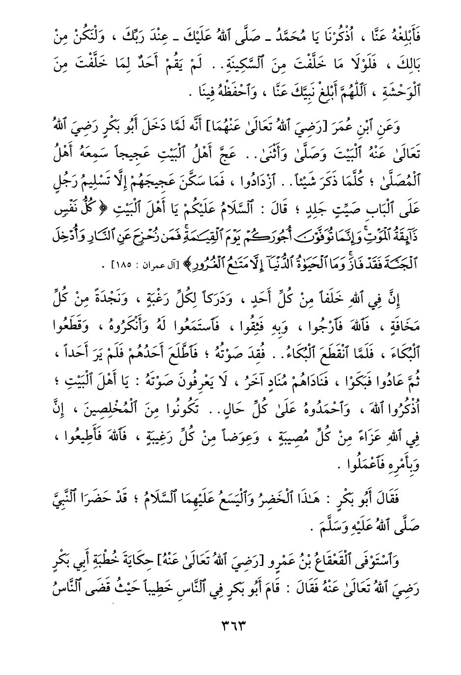 وعن ابن عمر [رضي الله تعالى عنهما] أنّه لمّا دخل أبو بكر رضي الله تعالى عنه البيت وصلّى وأثنى.. عجّ أهل البيت عجيجا سمعه أهل المصلّى؛ كلّما ذكر شيئا.. ازدادوا، فما سكّن عجيجهم إلّا تسليم رجل على الباب صيّت جلد؛ قال: السّلام عليكم يا أهل البيت كُلُّ نَفْسٍ ذائِقَةُ الْمَوْتِ وَإِنَّما تُوَفَّوْنَ أُجُورَكُمْ يَوْمَ الْقِيامَةِ فَمَنْ زُحْزِحَ عَنِ النَّارِ وَأُدْخِلَ الْجَنَّةَ فَقَدْ فازَ وَمَا الْحَياةُ الدُّنْيا إِلَّا مَتاعُ الْغُرُورِ [ال عمران: 185] .
