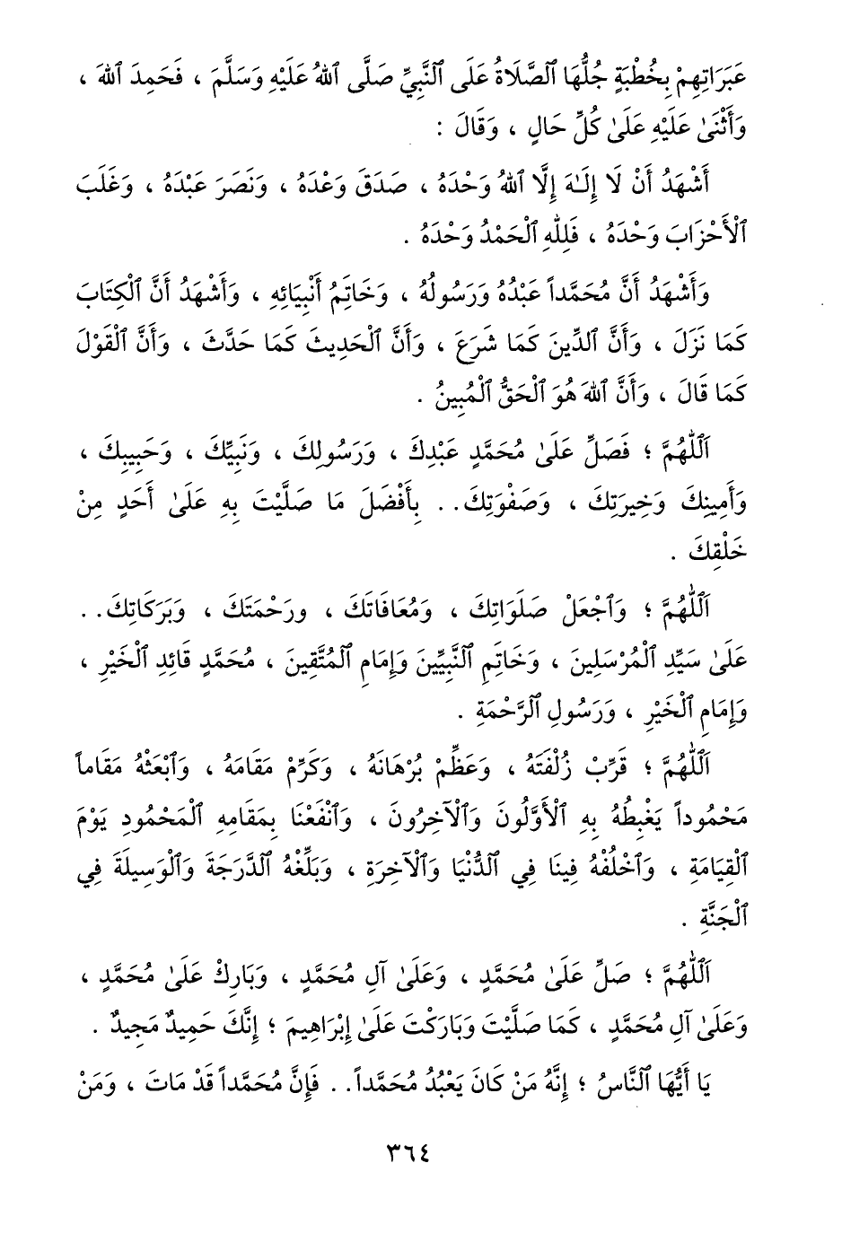 عبراتهم بخطبة جلّها الصّلاة على النّبيّ صلّى الله عليه وسلّم، فحمد الله، وأثنى عليه على كلّ حال، وقال: