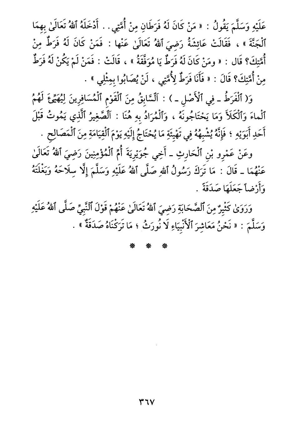 عليه وسلّم يقول: «من كان له فرطان من أمّتي.. أدخله الله تعالى بهما الجنّة» ، فقالت عائشة رضي الله تعالى عنها: فمن كان له فرط من أمّتك؟ قال: «ومن كان له فرط يا موفّقة» ، قالت: فمن لم يكن له فرط من أمّتك؟ قال: «فأنا فرط لأمّتي، لن يصابوا بمثلي» .