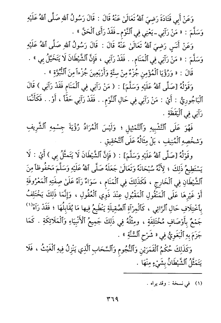 وقوله [صلّى الله عليه وسلّم] : (من راني في المنام فقد راني) قال الباجوريّ: أي: من راني في حال النّوم.. فقد راني حقّا، أو.. فكأنّما راني في اليقظة.