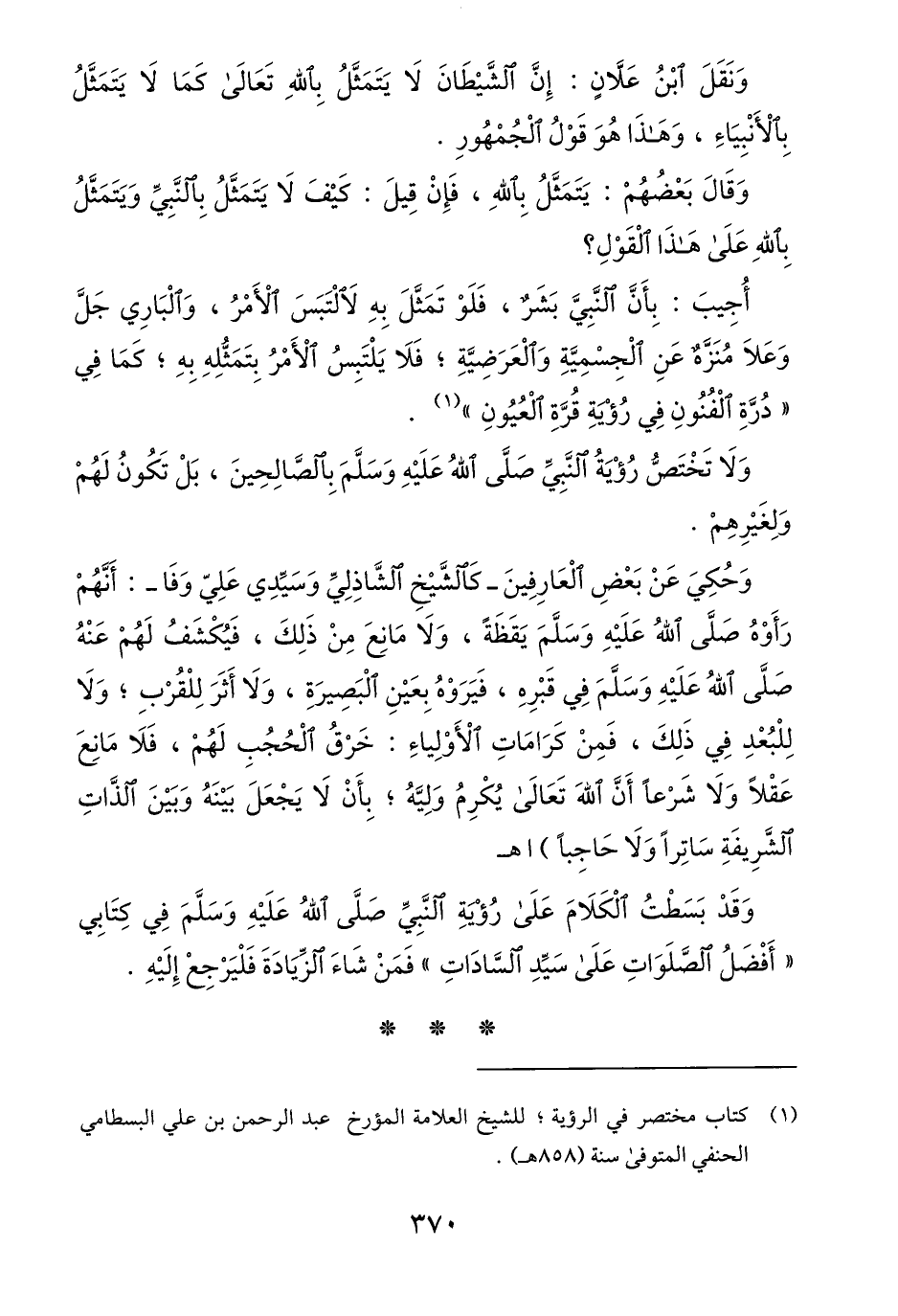 وقد بسطت الكلام على رؤية النّبيّ صلّى الله عليه وسلّم في كتابي «أفضل الصّلوات على سيّد السّادات» فمن شاء الزّيادة فليرجع إليه.