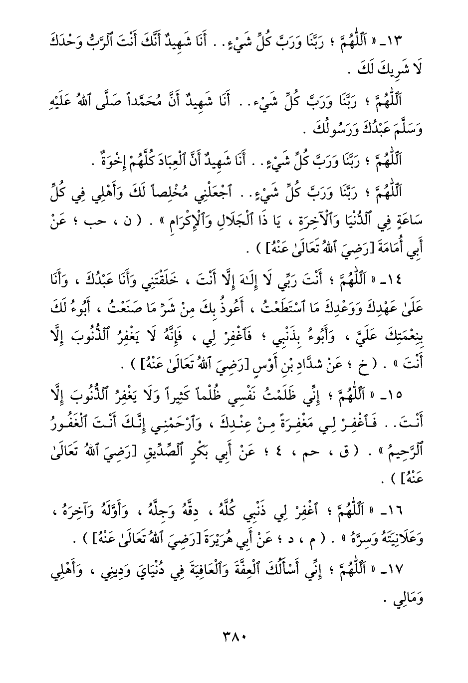 15- «اللهمّ؛ إنّي ظلمات نفسي ظلما كثيرا ولا يغفر الذّنوب إلّا أنت.. فاغفر لي مغفرة من عندك، وارحمني إنّك أنت الغفور الرّحيم» . (ق، حم، 4؛ عن أبي بكر الصّدّيق [رضي الله تعالى عنه] ) .