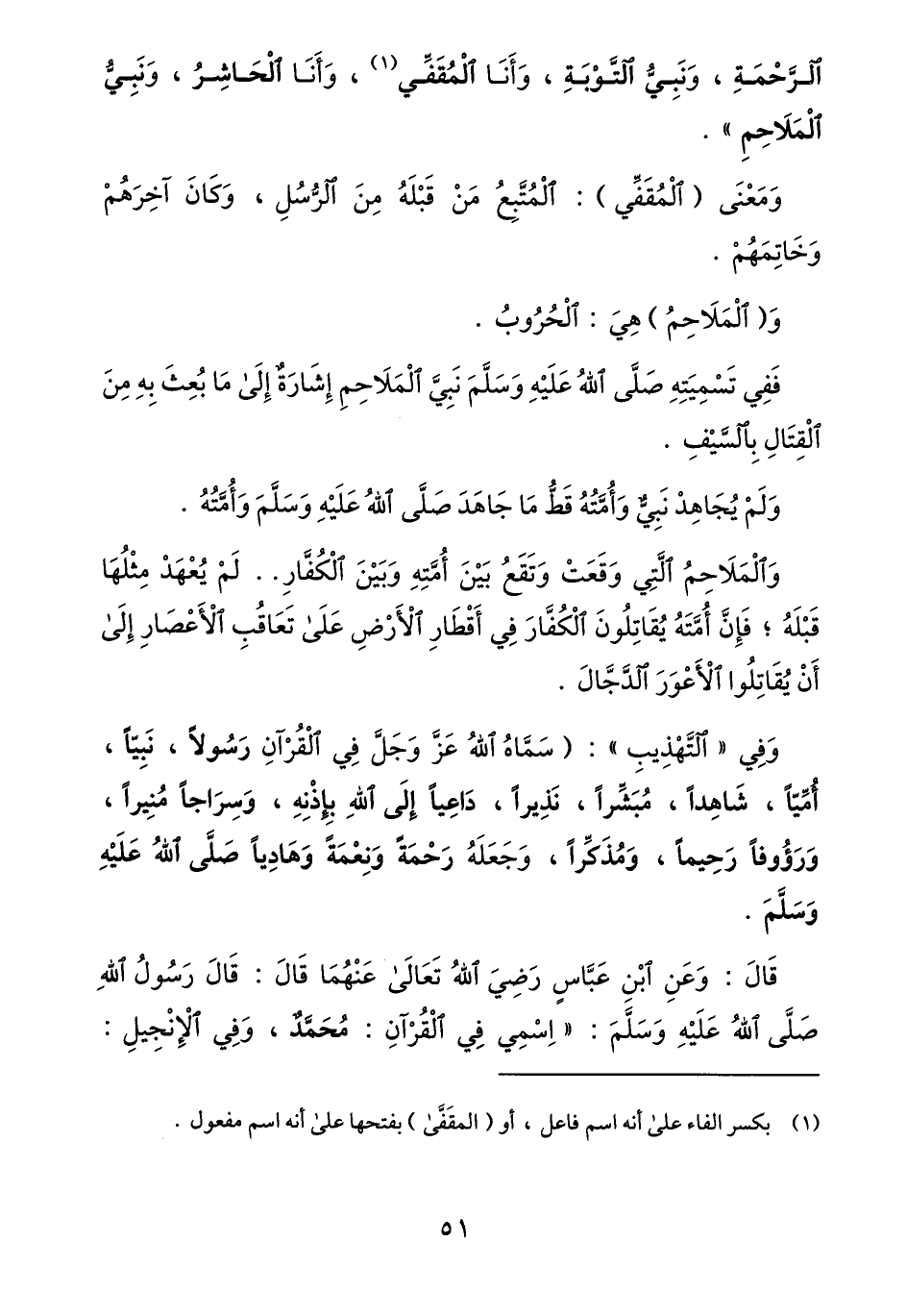 الرّحمة، ونبيّ التّوبة، وأنا المقفّي «1» ، وأنا الحاشر، ونبيّ الملاحم» .