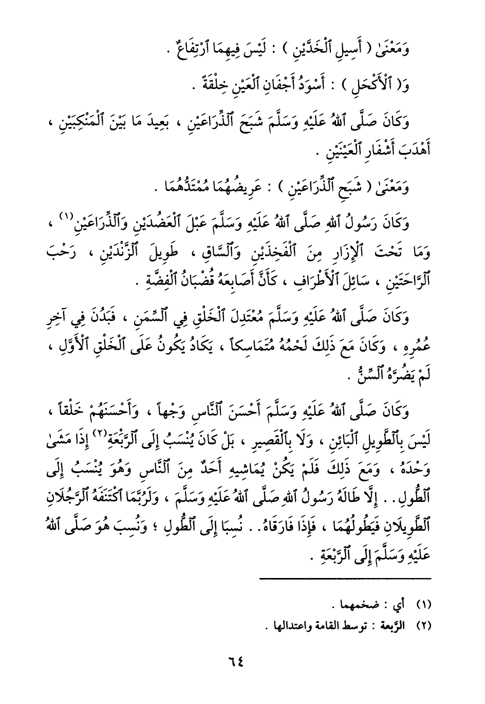 وكان صلّى الله عليه وسلّم شبح الذّراعين، بعيد ما بين المنكبين، أهدب أشفار العينين.
