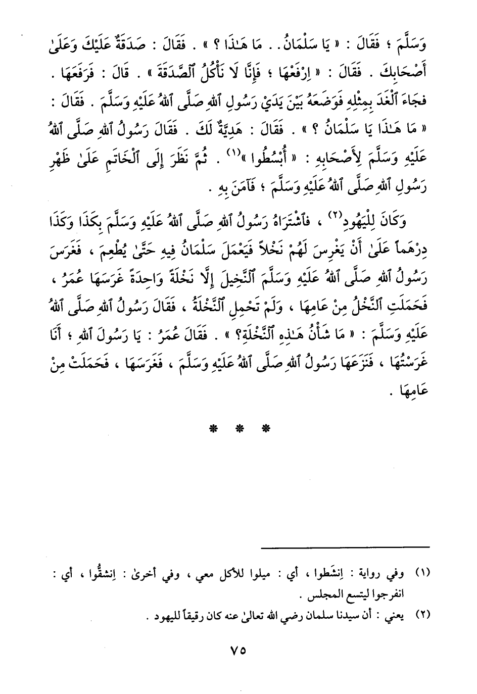 وسلّم؛ فقال: «يا سلمان.. ما هذا؟» . فقال: صدقة عليك وعلى أصحابك. فقال: «ارفعها؛ فإنّا لا نأكل الصّدقة» . قال: فرفعها.